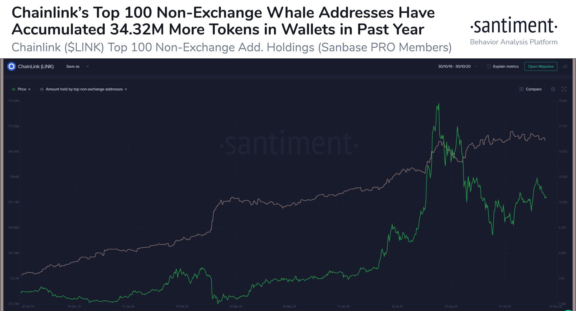 Theo công ty phân tích Santiment, nhóm 100 người nắm giữ Chainlink hàng đầu đang đẩy mạnh việc mua vào tại các mức giá hiện tại. Nó cho thấy đồng coin này đang có được sự hỗ trợ mạnh mẽ từ bên mua và đồng thời các nhà đầu tư lớn cũng tin tưởng là một tăng trưởng sắp xảy ra.