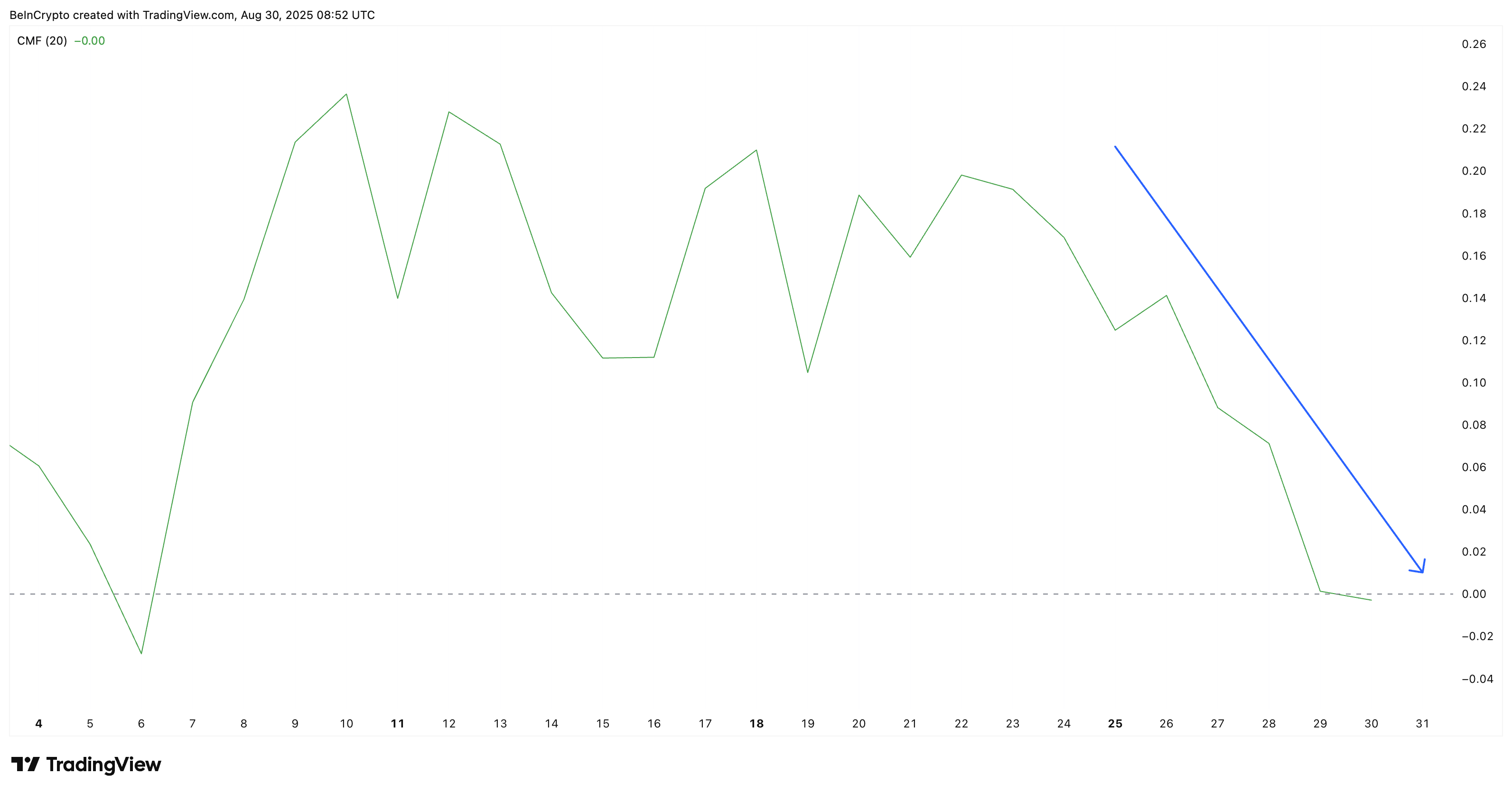 Thêm vào đó, Chaikin Money Flow (CMF), theo dõi dòng vốn vào và ra, đã có xu hướng giảm từ ngày 22/08/2025 và cuối cùng đã trượt xuống dưới 0 vào ngày 29/08/2025 lần đầu tiên kể từ ngày 06/08/2025. Sự chuyển dịch vào vùng tiêu cực này báo hiệu áp lực mua và dòng vốn vào đang giảm, củng cố khả năng điều chỉnh giảm.