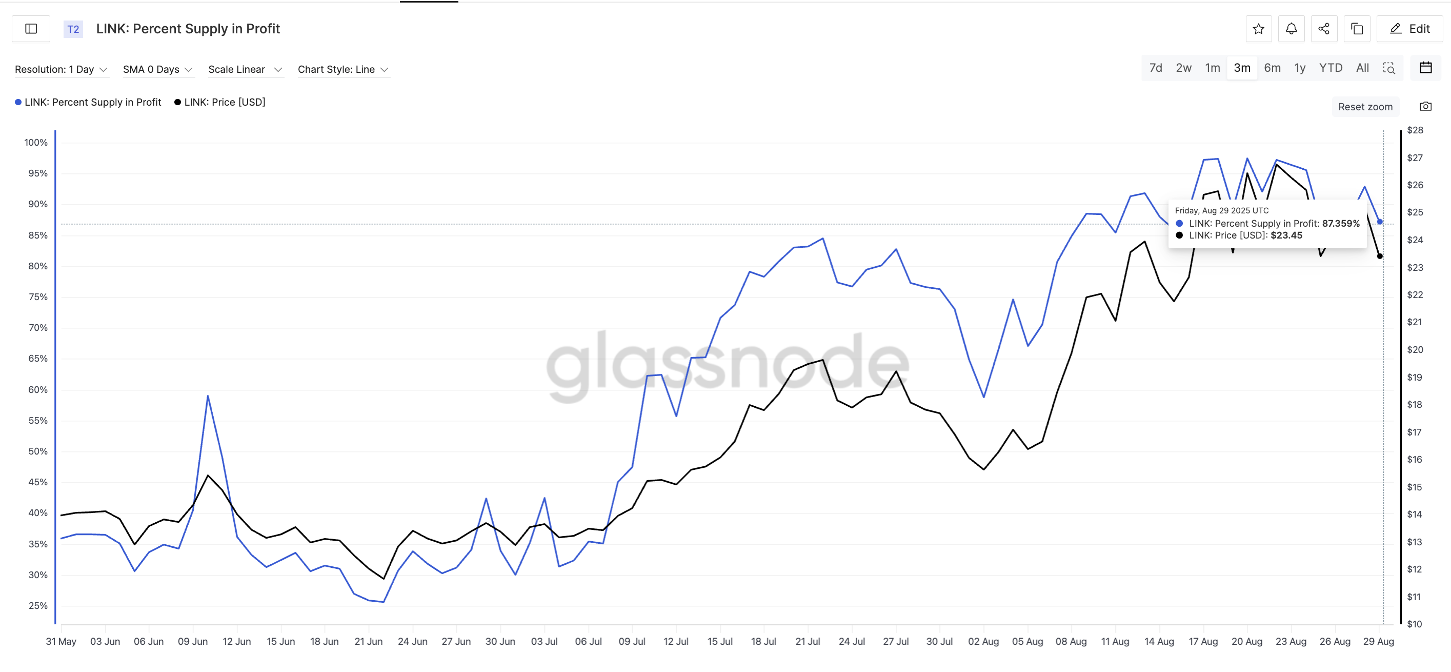 Tính đến ngày 29/08/2025, gần 87.4% nguồn cung lưu thông đang có lợi nhuận, gần với đỉnh gần đây là 97.5% vào ngày 20/08/2025. Đỉnh này trùng với đợt tăng giá LINK lên 26.45 USD, sau đó nhanh chóng giảm hơn 6% xuống còn 24.82 USD vào ngày hôm sau.
