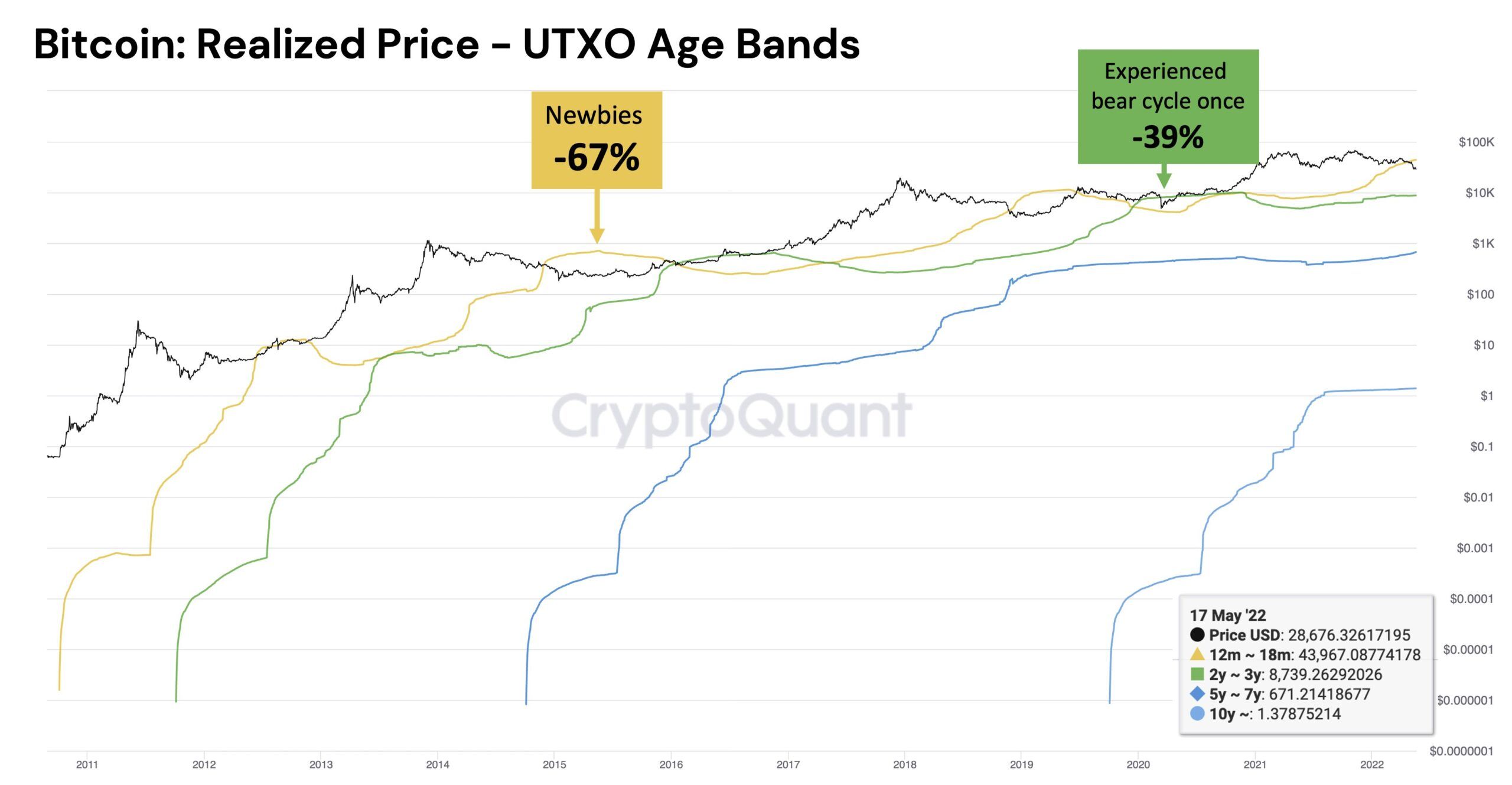 Nếu dựa vào mức trung bình giá hiện thực của Bitcoin (Realized Price), thì một nhà đầu tư mới vào thị trường 2022 đang mất khoảng 67% vốn ban đầu. Còn nếu là nhà đầu tư đã có một năm kinh nghiệm thì mất 39%.