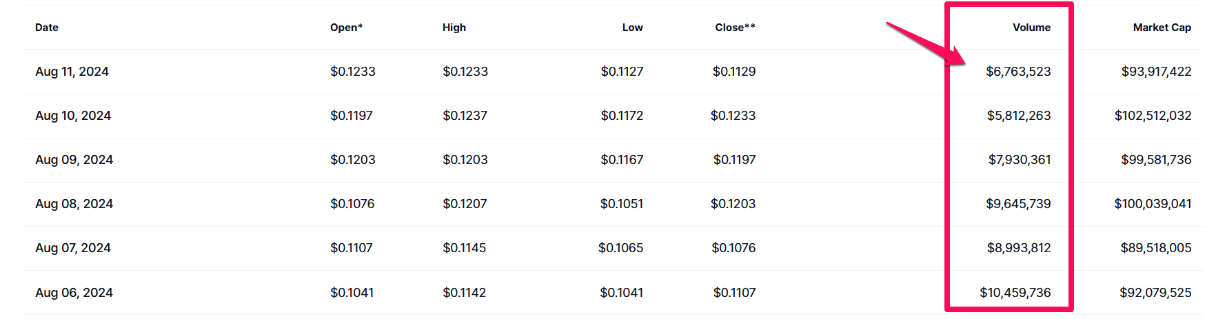 Không khó để kiểm tra khối lượng giao dịch Altcoin. Sử dụng nền tảng CoinMarketCap trong mục “See historical data” sẽ giúp nhà đầu tư xác định khối lượng trong ngày thay đổi ra sao. Và bằng cách so sánh khối lượng với biến động giá của Altcoin đó, holder có thể đánh giá sự hào hứng/kỳ vọng của nhà đầu tư nói chung đối với dự án.