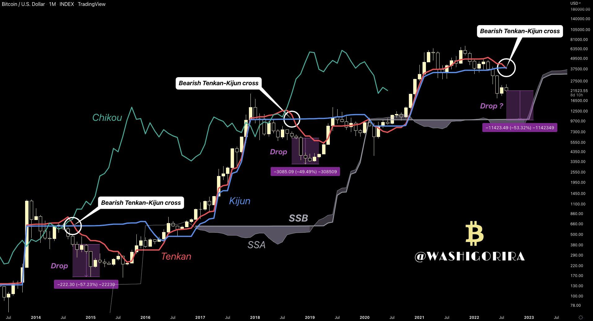 Sponsored- Giao cắt xấu giữa Tenkan và Kijun khung tháng xuất hiện đã đánh dấu sự bắt đầu đợt giảm với biên độ đến 50%. Điều này đã xảy ra hai lần trong năm 2014 và 2018. Ngược lại khi Tenkan cắt lên Kijun nó xác nhận thị trường uptrend. Có thể thấy, Ichimoku khung tháng là chỉ báo hiếm hoi không bị “nhiễu” vì sự sụp đổ thị trường vào tháng 3/2022 vì Covid-19.