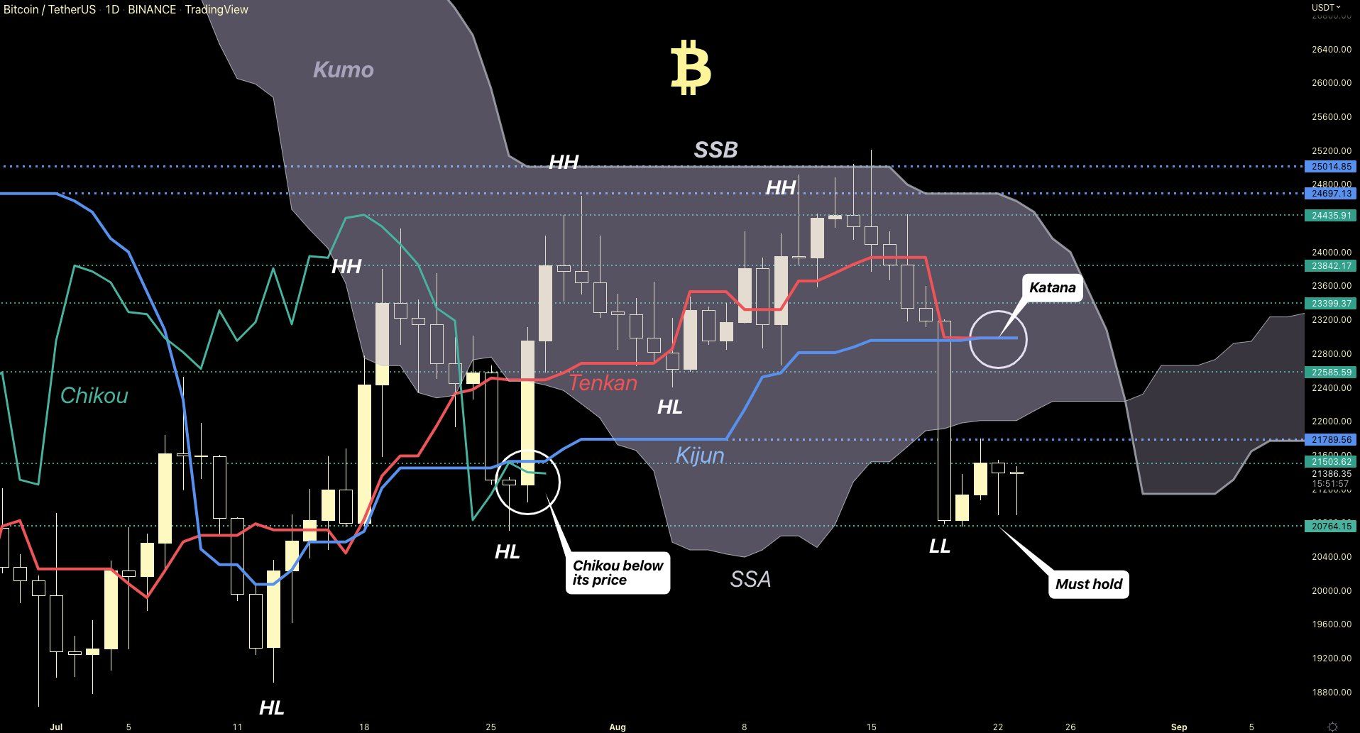 Tóm lại, Bitcoin vẫn đang được hỗ trợ ở quanh 21,000 USD. Kháng cự gần trong ngắn hạn là 22,900 USD. Và trong nhiều tháng tới Bitcoin vẫn chưa thể uptrend trở lại, cho đến khi nào chúng ta nhìn thấy tín hiệu Tenkan cắt lên Kijun khung tháng.