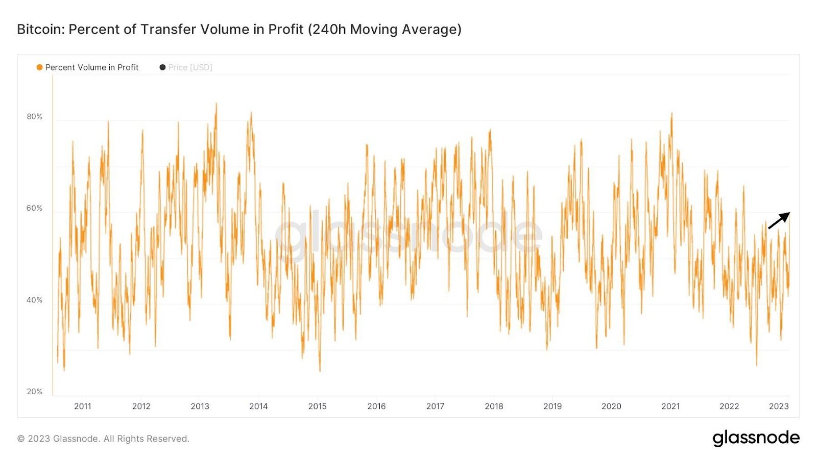 Đương nhiên, phạm vi trên của tỷ lệ phần trăm Transfer volume in profit thường xuất hiện trong các xu hướng tăng ngắn hạn của giá BTC. Phạm vi thấp hơn được nhìn thấy trong các xu hướng giảm ngắn hạn. Đồng thời, xu hướng tăng và giảm dài hạn của chỉ báo này cũng tương ứng với thị trường giá lên và xuống của Bitcoin. Mặc dù vậy, chúng vẫn chạy trong phạm vi rộng hàng chục phần trăm.