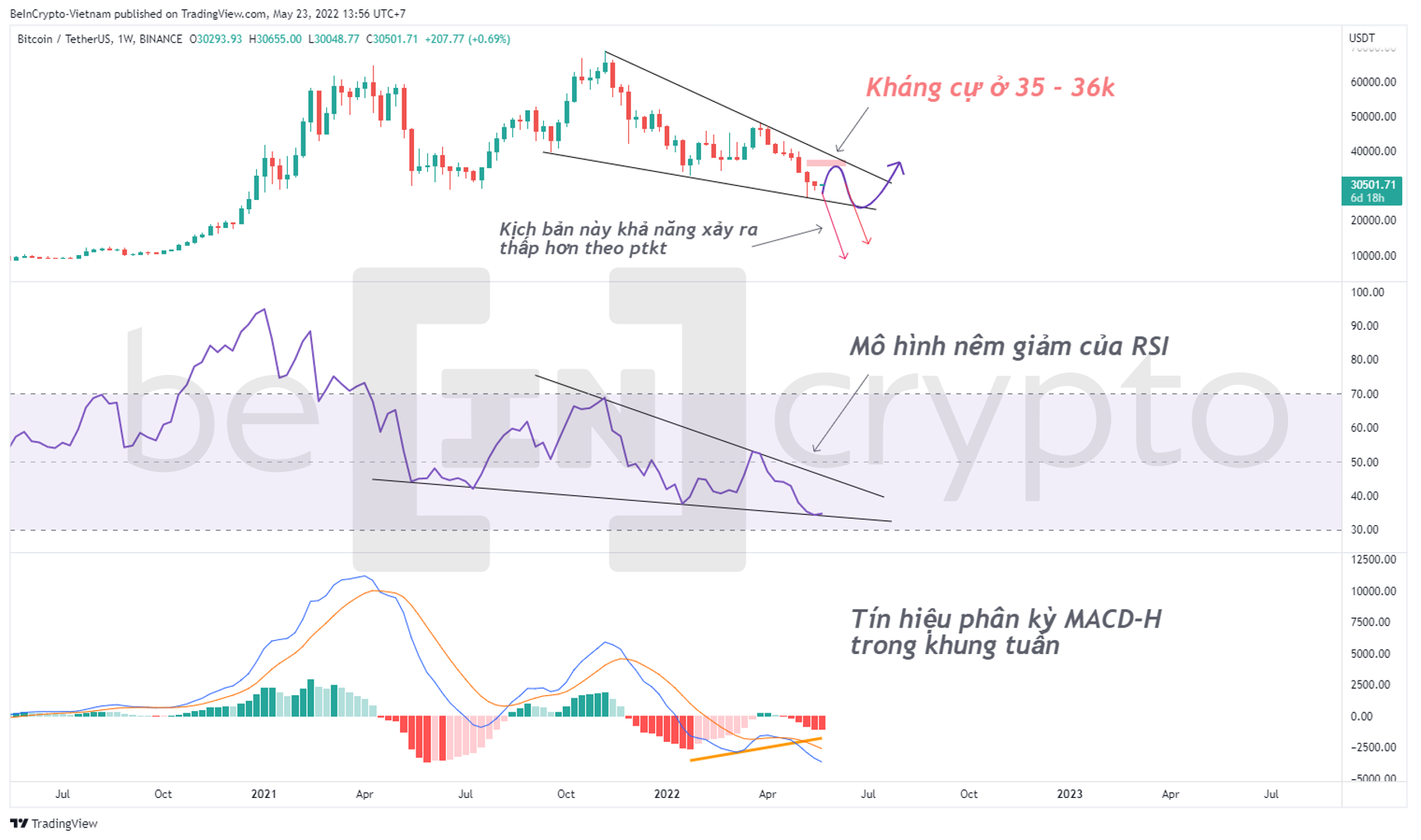 - Bên cạnh đó, RSI khung tuần cũng đã chạm trendline dưới của mô hình nêm giảm, đồng thời thể hiện tín hiệu bật lên. Những phản ứng này rất “giáo khoa” theo phân tích kỹ thuật.