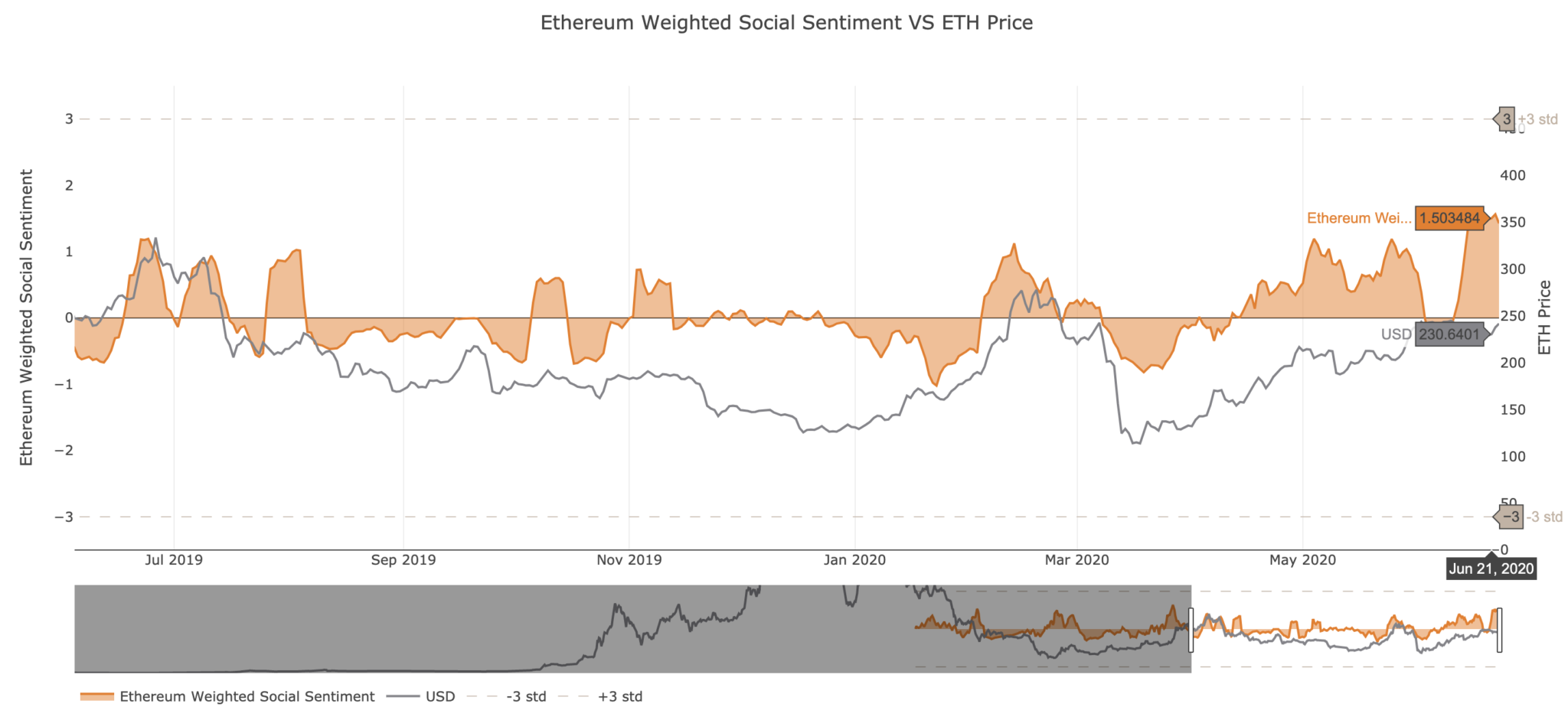 Vào cuối năm 2019 chẳng hạn, Ethereum đã phải chịu đựng một cú sụt giảm 47% sau khi cảm nhận xã hội của nó tăng lên 1,2. Hiện tượng tương tự cũng đã xảy ra giữa tháng 2/2020, khi ETH giảm gần 70%.