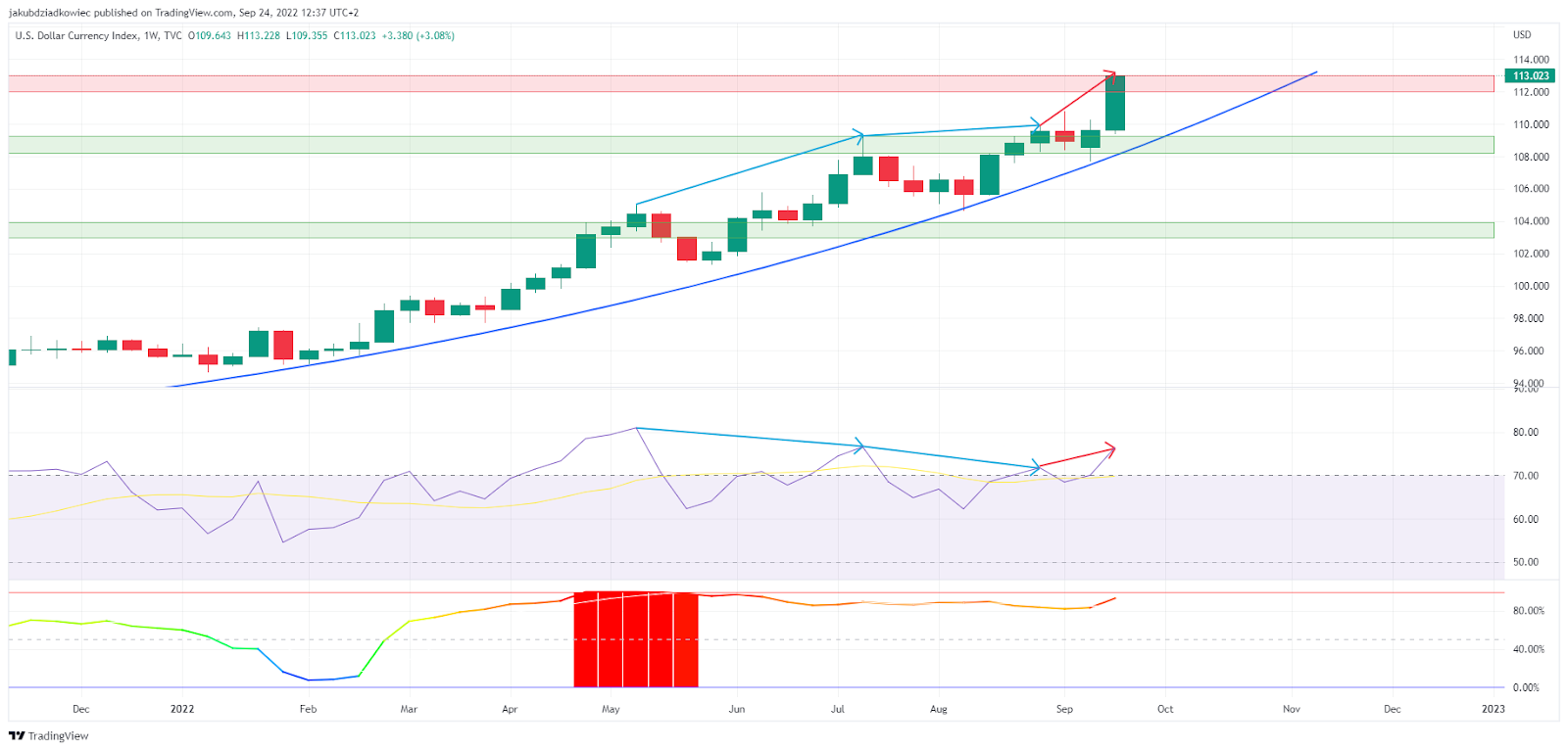 Điều này có vẻ khả thi sau khi DXY đạt đến vùng kháng cự tại mức 109. Tuy nhiên, sau đó nó có độ lệch khoảng 4% và bật ra khỏi vùng 105, biến nó thành hỗ trợ. Một vài tuần sau, nó lại chạm đến mức 109 và cuối cùng đã bứt phá mạnh mẽ trong tuần này, tạo thành một cây nến xanh 3% kỷ lục (mũi tên xanh dương).