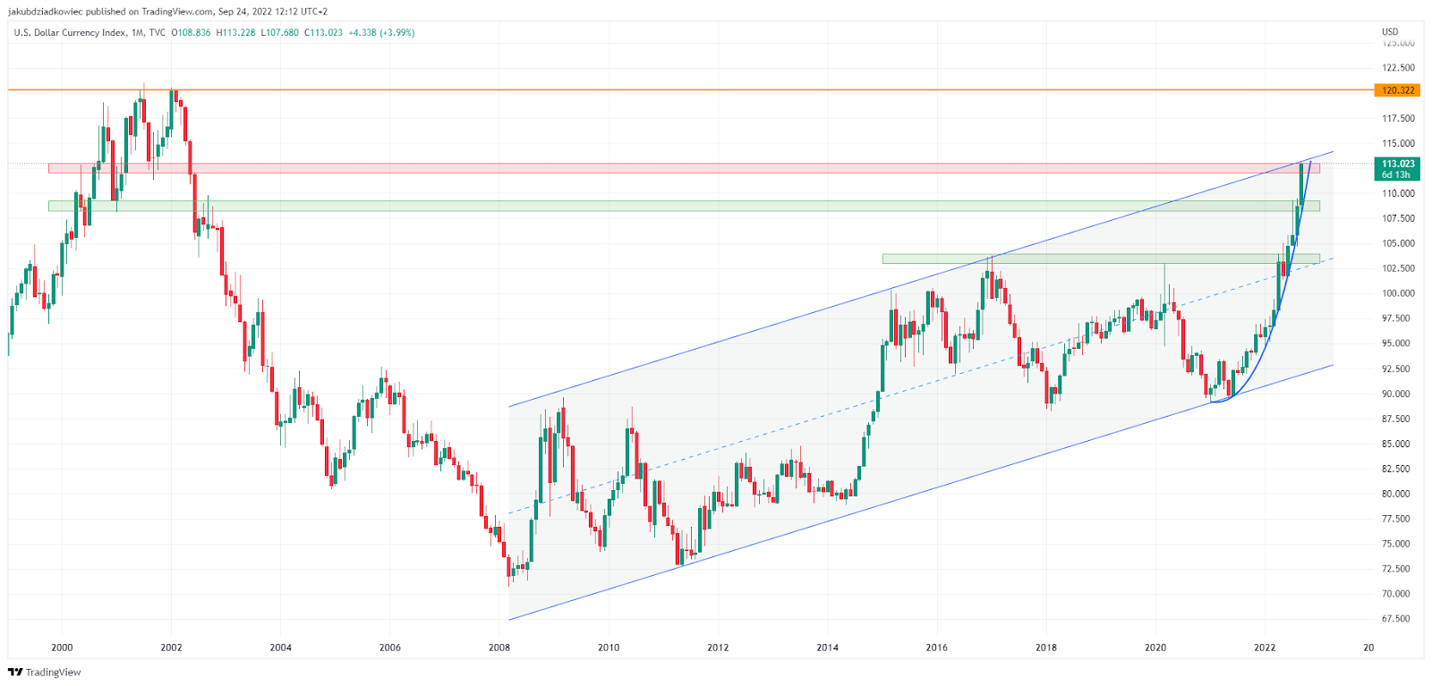 Hiện tại, chúng ta thấy rằng DXY đã đạt đến một vùng kháng cự khác trong khoảng 112 – 113. Nếu nó bị phá vỡ, vùng kháng cự chính tiếp theo chỉ ở 120 (đường màu cam). Mức kháng cự này được đánh dấu bằng đỉnh vĩ mô vào đầu năm 2002.