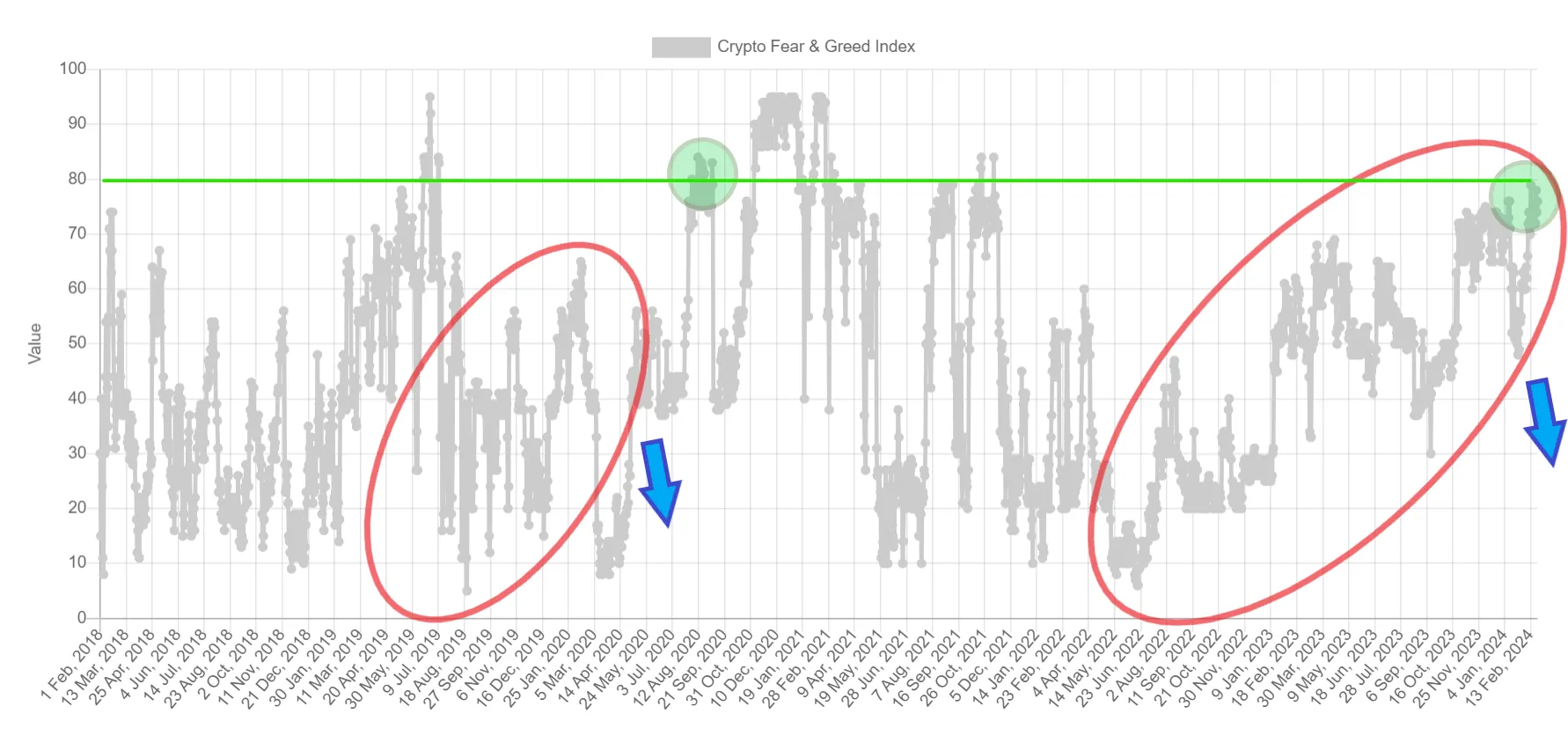 Vụ sụp đổ năm 2020 kết thúc với việc chỉ số Sợ hãi và Tham lam quay trở lại vùng cực kỳ sợ hãi, ở mức gần 10. Điều này xảy ra 3 tháng trước đợt Halving trước đó của Bitcoin. Trong điều kiện hiện tại, 2 tháng trước khi Halving và thị trường khá nóng, khả năng điều chỉnh sâu hơn (mũi tên xanh) vẫn cao.