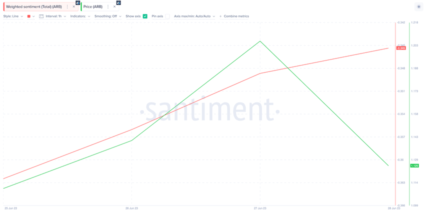 Biểu đồ bên dưới cho thấy ở mức -0.34, ARB Weighted Sentiment nằm hoàn toàn trong vùng trung tính. So với thời điểm đầu tuần, chỉ số thực sự có xu hướng tăng 5%, báo hiệu một sự thay đổi ròng tích cực trong các đề cập đến Arbitrum trên mạng xã hội.