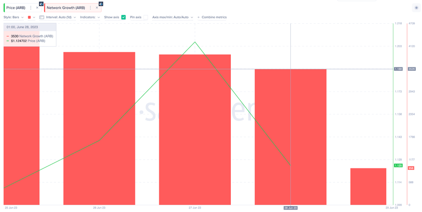 Vào ngày 25/6, Arbitrum đã ghi nhận 4,663 địa chỉ mới. Nhưng như phần số liệu được tô màu đỏ bên dưới, số lượng địa chỉ mới đã giảm 35% xuống chỉ còn 3,530 vào cuối ngày 28/6.