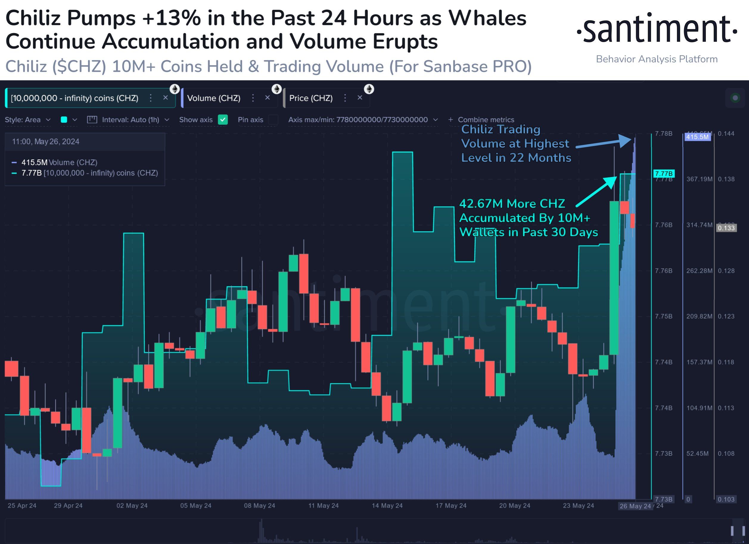 Sponsored- Cụ thể, dữ liệu từ Santiment cho biết, trong 30 ngày qua, những ví có số dư từ trên 10 triệu CHZ đã tích lũy hơn 42.67 triệu CHZ. Song song với hoạt động tích lũy này, giá CHZ đã tăng 68% từ đầu tháng 4, và lập mức cao nhất trong hai tháng gần đây.