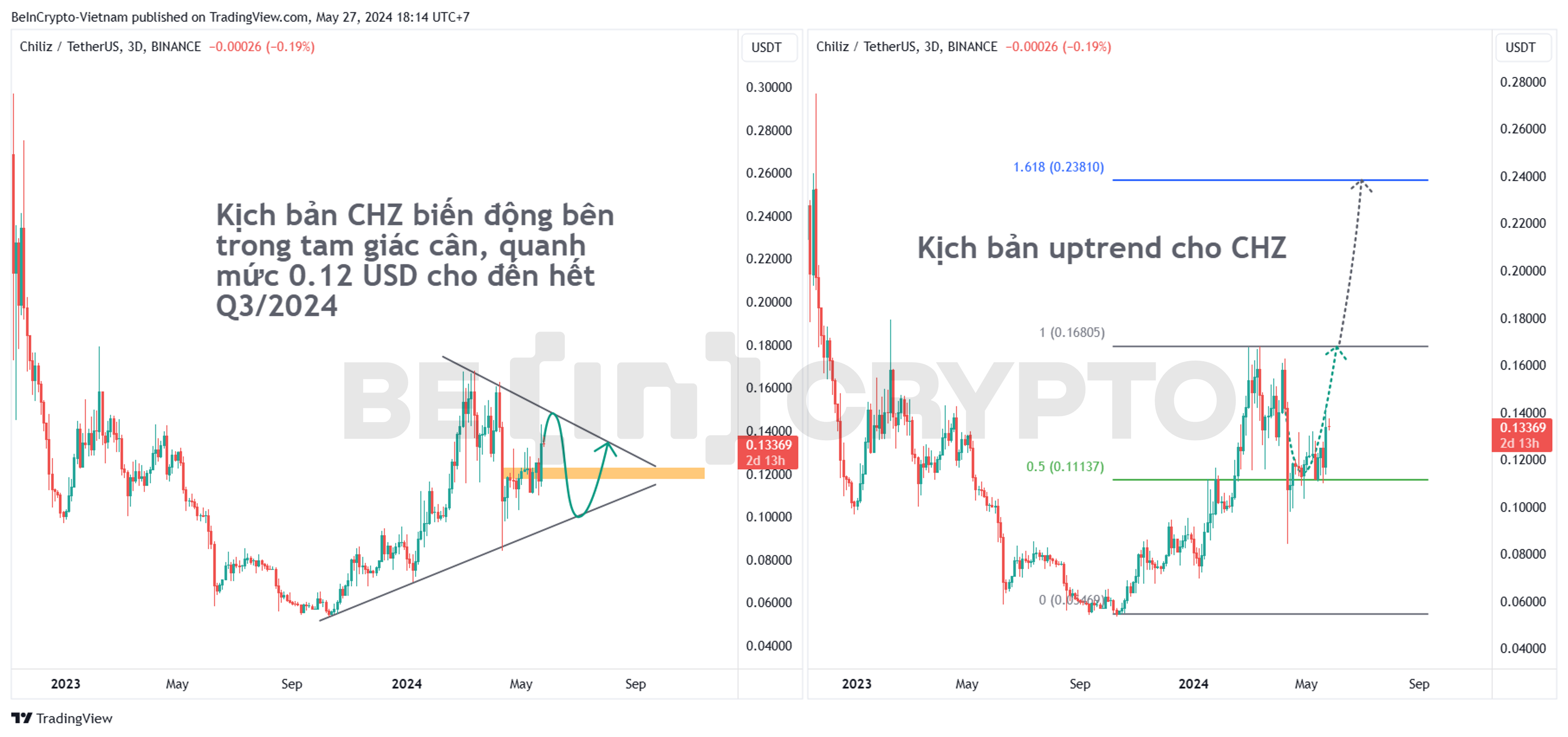 - Kịch bản đầu tiên là CHZ sẽ tiếp tục tăng trong ngắn hạn, có thể tăng đến 0.15 USD trong cuối tháng 5 hoặc đầu tháng 6. Nhưng đường giá sẽ vẫn duy trì bên trong tam giác cân lớn của nửa đầu 2024. Cấu trúc tam giác cân này giữ giá CHZ xoay quanh vùng 0.12 USD cho đến khi thật sự breakout.