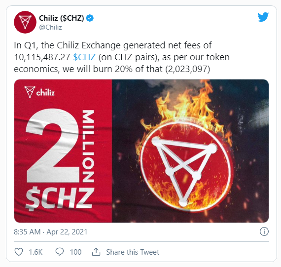 Theo Chiliz, công ty đã đốt tổng cộng 2,023,097 CHZ token, tương đương hơn 1 triệu đô la. Số token bị đốt chiếm khoảng 20% lượng CHZ mà công ty nhận được dưới dạng phí. Phí này được trả bởi người dùng trong quá trình giao dịch trên các sàn của công ty trong ba tháng đầu năm 2021.