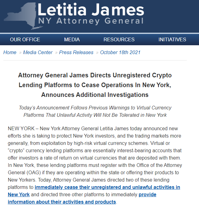 Mới ngày hôm qua, trang web chính thức của Tổng chưởng lý New York đã công bố chỉ đạo của Tổng chưởng lý Letitia James về việc ngừng hoạt động các nền tảng cho vay tiền điện tử chưa đăng ký ở New York, và tiến hành thực hiện các cuộc điều tra bổ sung.