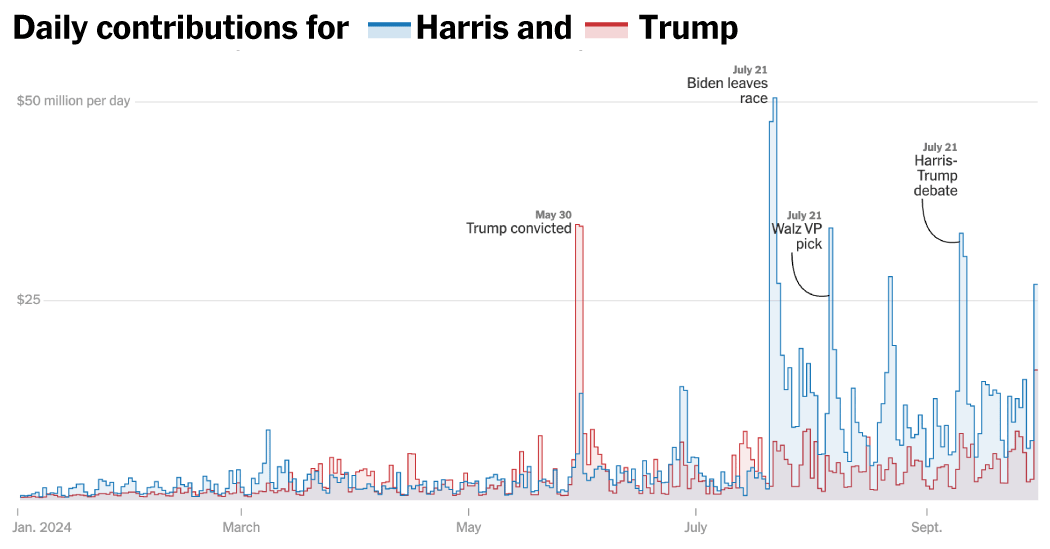 The New York Times báo cáo rằng chiến dịch của Phó Tổng thống Kamala Harris đã đạt được kỷ lục quyên góp trong một quý lịch sử, với tổng số 1 tỷ USD. Harris đã thu được 378 triệu USD chỉ trong tháng 9, so với 160 triệu USD của Trump. Cho đến nay trong tháng 10, Harris đã quyên góp được 348 triệu USD, trong khi chiến dịch của Trump đã thu được 283 triệu USD.