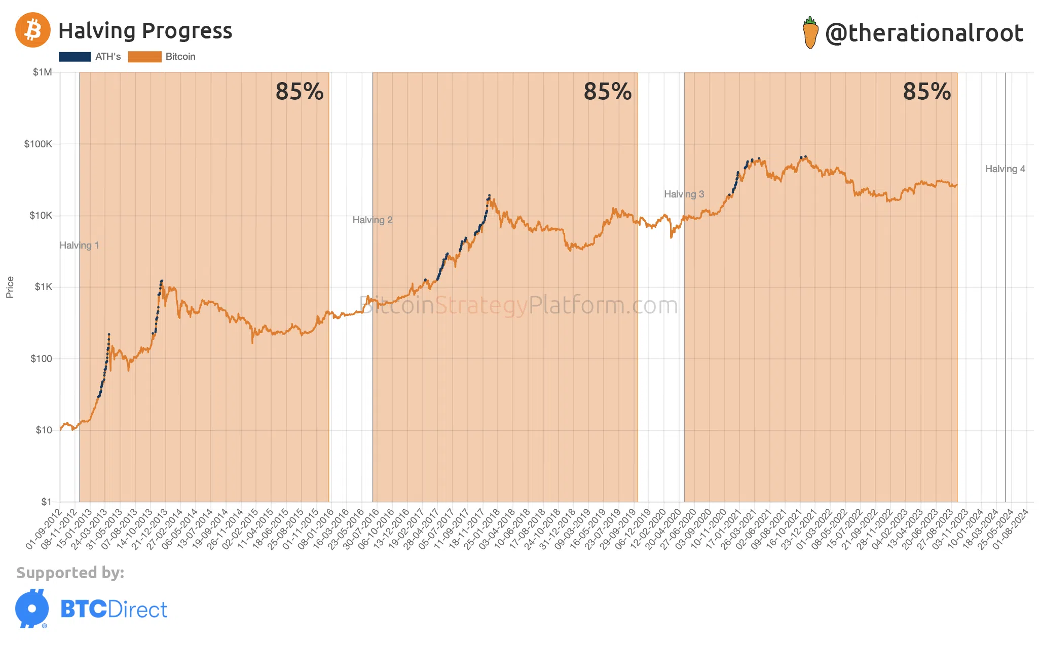 Nhà phân tích ở trên cũng công bố một biểu đồ khác cho thấy tỷ lệ hoàn thành của chu kỳ Bitcoin Halving 2024. Nó so sánh các khoảng thời gian giữa Halving lịch sử của 3 chu kỳ trước đó.