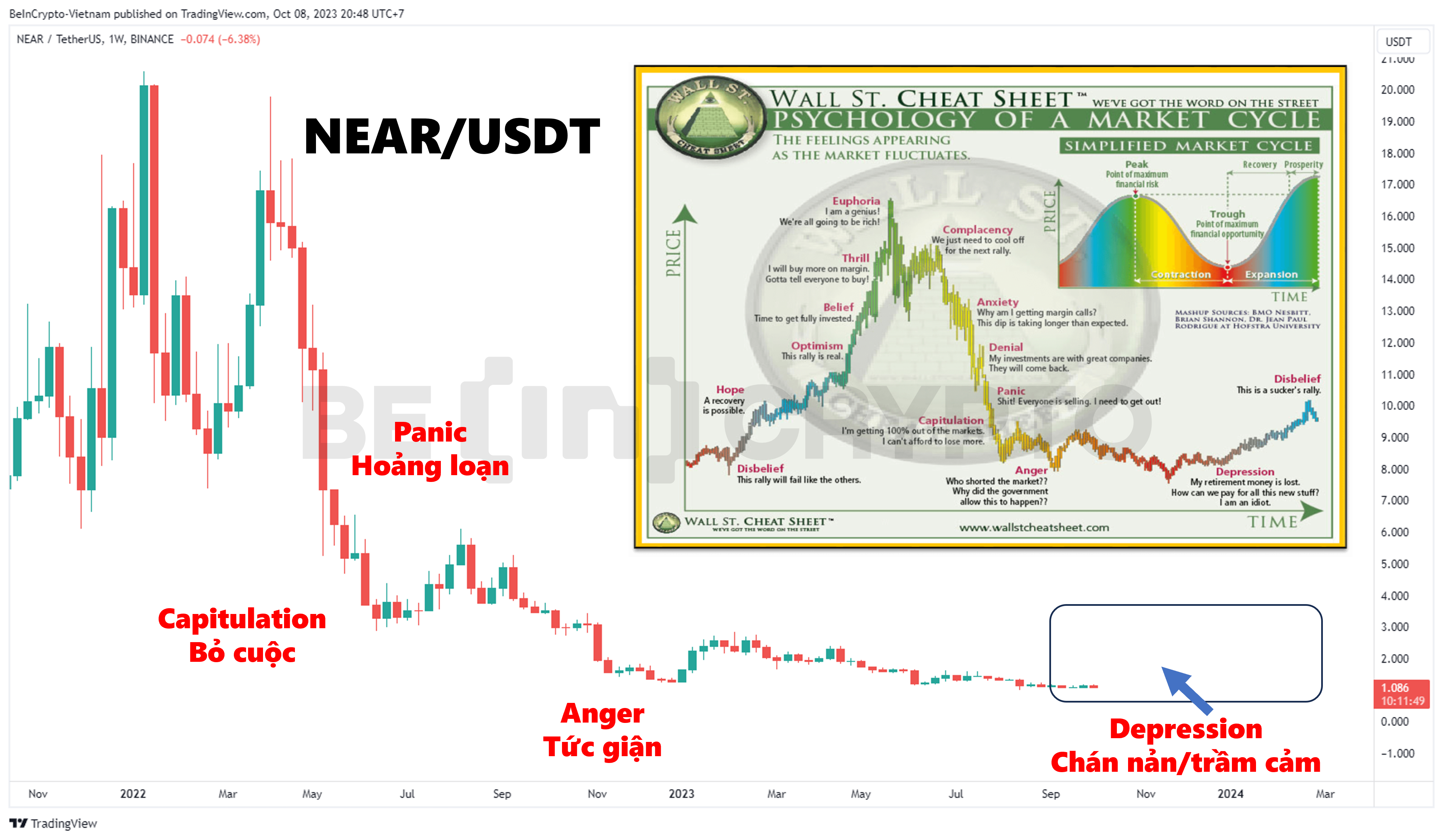 NEAR giảm gần 95% trong suốt downtrend vừa qua. Để trở lại đỉnh cũ, NEAR gần phải tăng gần 2,000%, điều này nghe như một điều không tưởng. Nhưng một mức tăng khiếm tốn hơn như đến vùng 4 USD – 5 USD thì vẫn khả thi theo mô hình chu kỳ tâm lý thị trường.