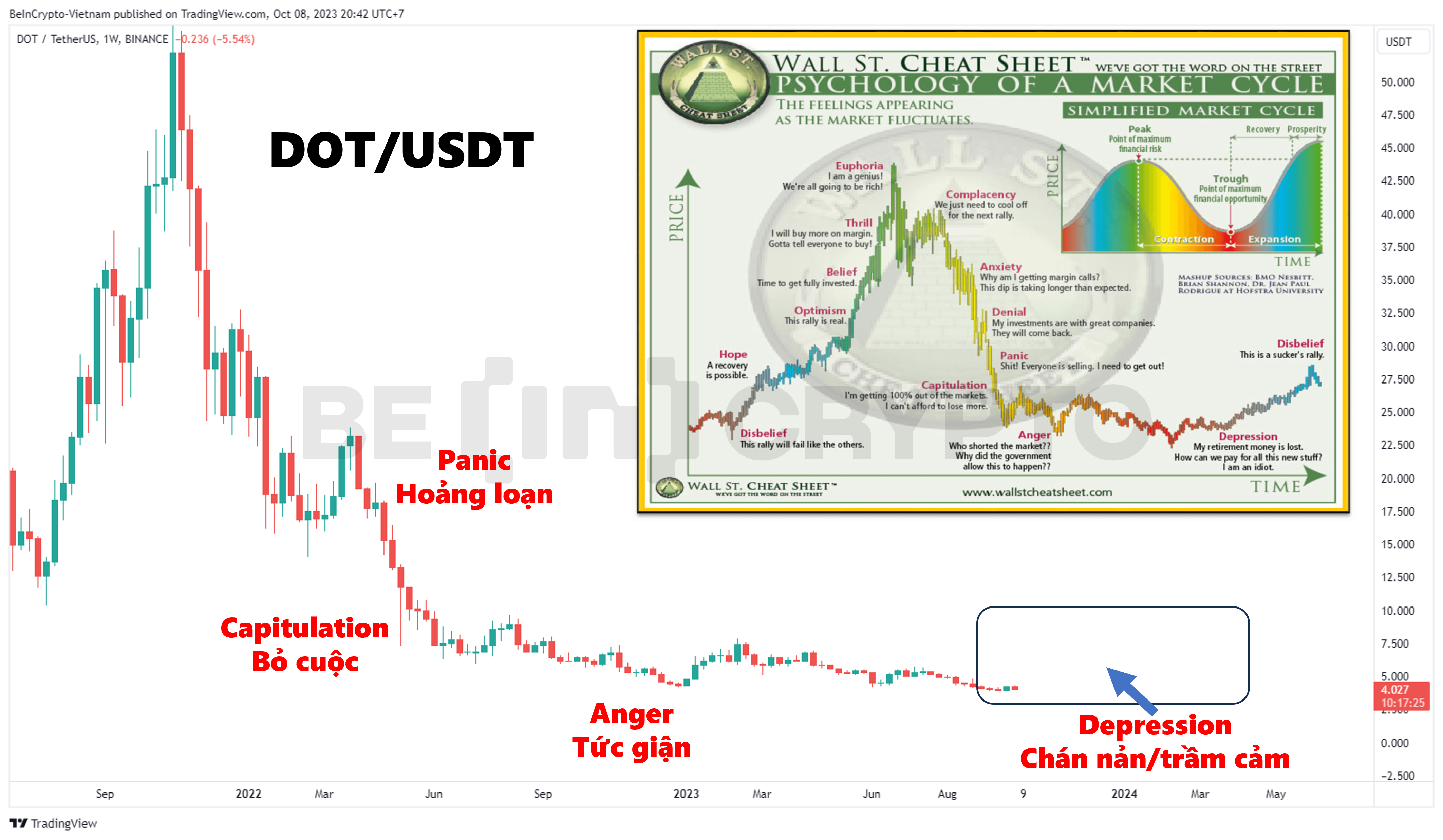 Tuy nhiên, AVAX dưới 4 USD có thể là cơ hội cho năm 2024 vì hiện là giai đoạn depression. DOT có thể không còn tăng mạnh mẽ như hồi 2021, nhưng vị thế hiện tại là vị thế tốt nhất trong chu kỳ tâm lý. Và theo chu kỳ này, DOT có khả năng tăng đến 10 USD – 15 USD vào năm sau.