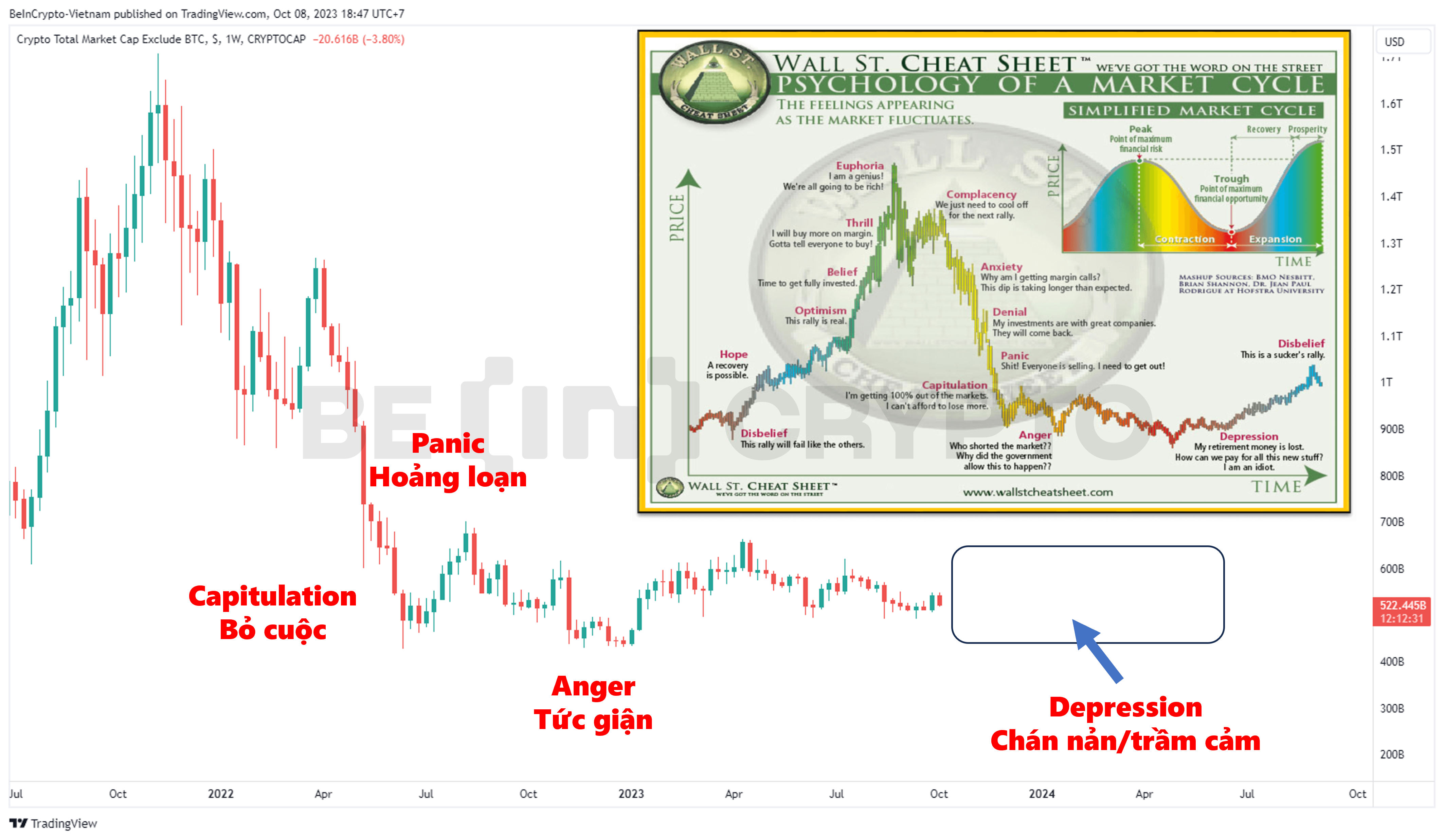 Tổng vốn hóa Altcoin đã giảm đến 75% trong hai năm qua. Trong một năm gần đây, vốn hóa đã đi ngang quanh 500 tỷ USD và không lập đáy mới. Với ngần đó dữ liệu có thể đã đủ để áp dụng mô hình chu kỳ tâm lý thị trường.