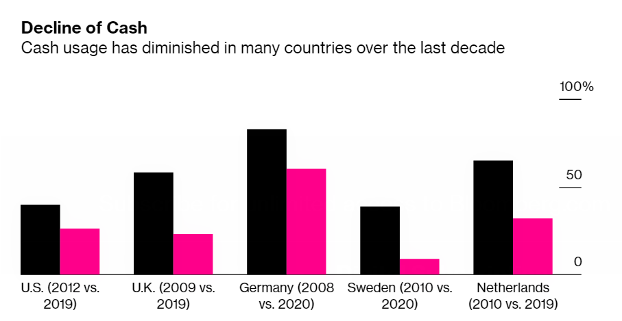 Theo thông tin từ Bloomberg, nhu cầu sử dụng tiền mặt tại Mỹ và châu Âu đã giảm sau nhiều năm. Có thể, công dân của các nước này muốn sử dụng phương thức thanh toán hiện đại hơn.