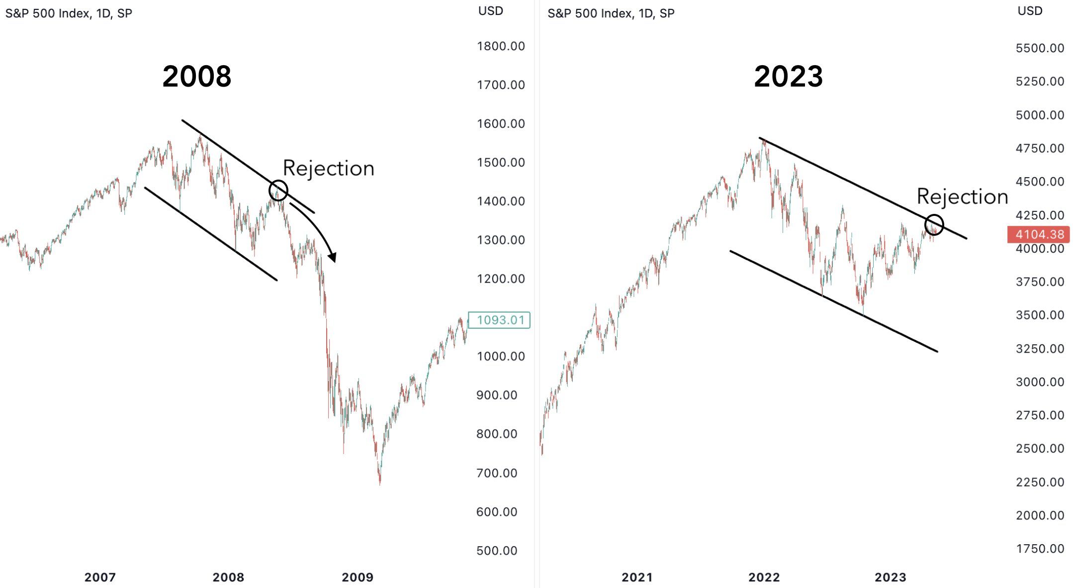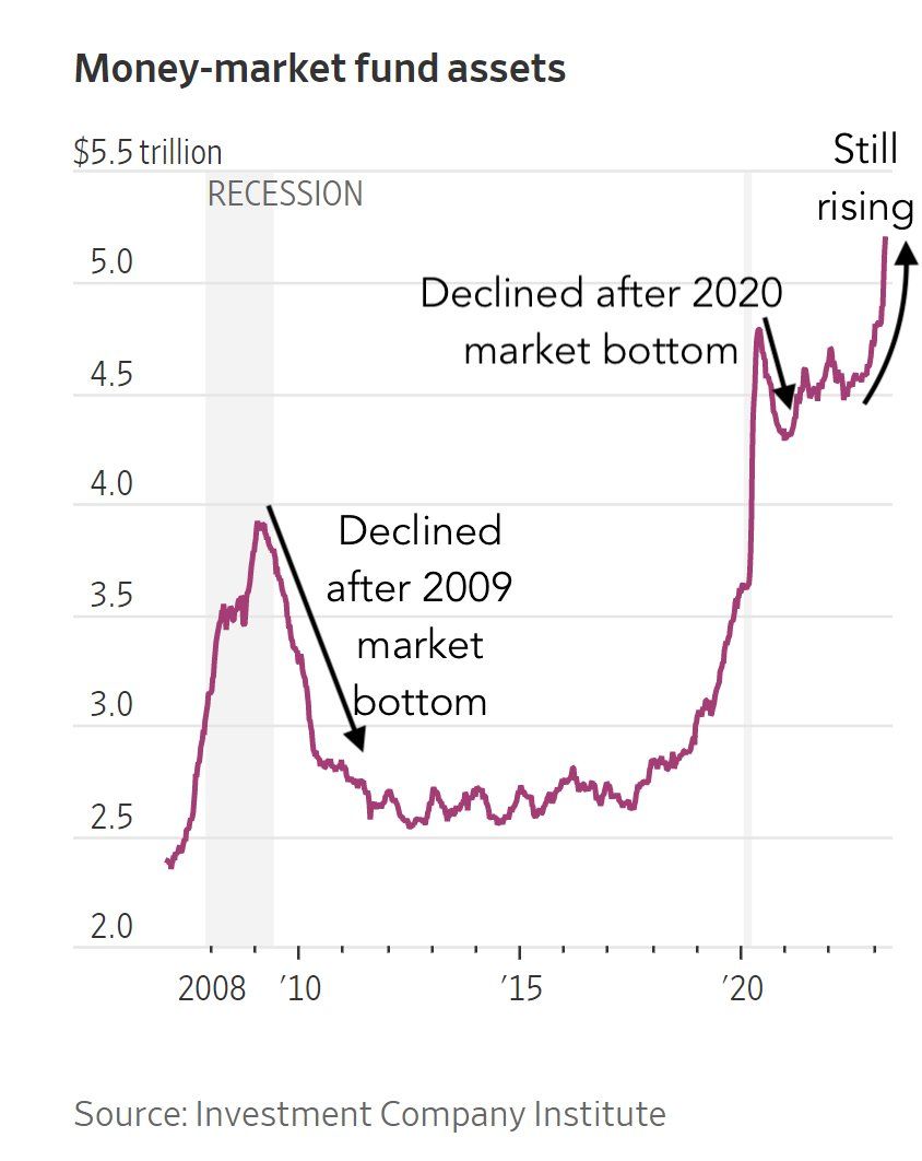 - @GameofTrades_ nhận thấy đặc điểm kỹ thuật chung trong bong bóng dotcom, khủng hoảng 2008 và 2023 là một kênh song song giảm giá. Trong đó, điểm “rejection” đánh dấu đà phục hồi cuối cùng trước khi giảm thêm 50% nữa trong 1,5 năm kế tiếp. Khoảng thời gian này, MMF liên tục lập đỉnh.