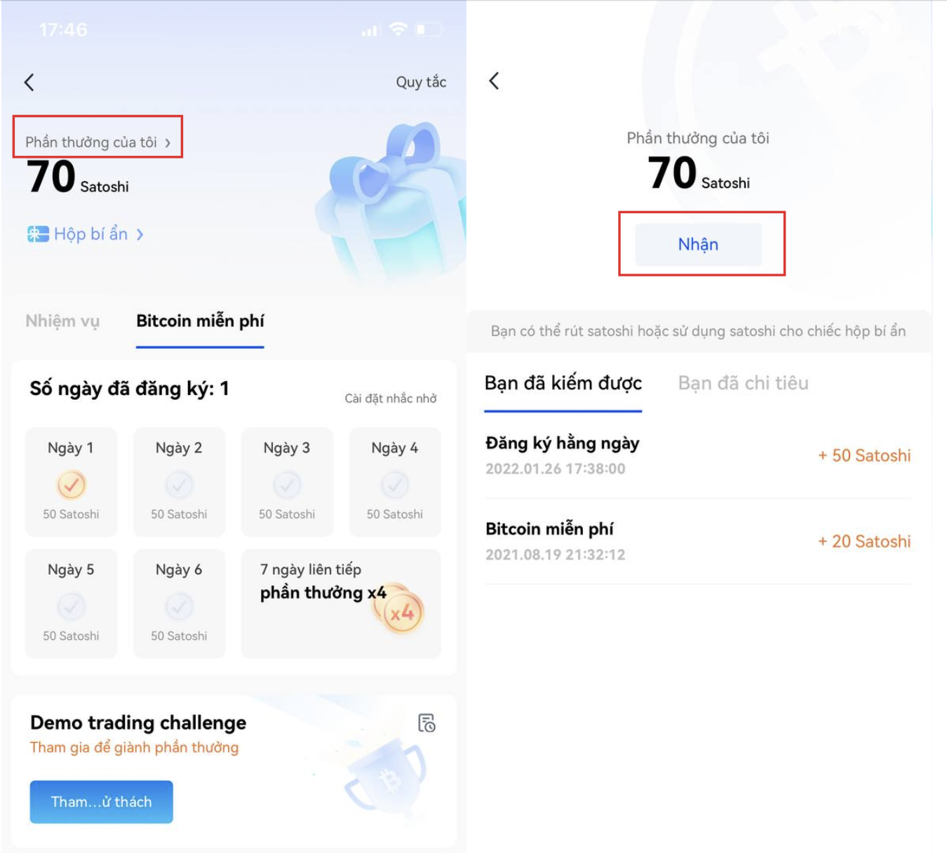 Người dùng quan tâm đến việc thực hiện các tác vụ nâng cao như giao dịch demo, đăng ký sản phẩm Kiếm tiền hoặc giao dịch bất kỳ số lượng tiền mã hoá nào có thể kiếm được tới 300 satoshi làm phần thưởng.