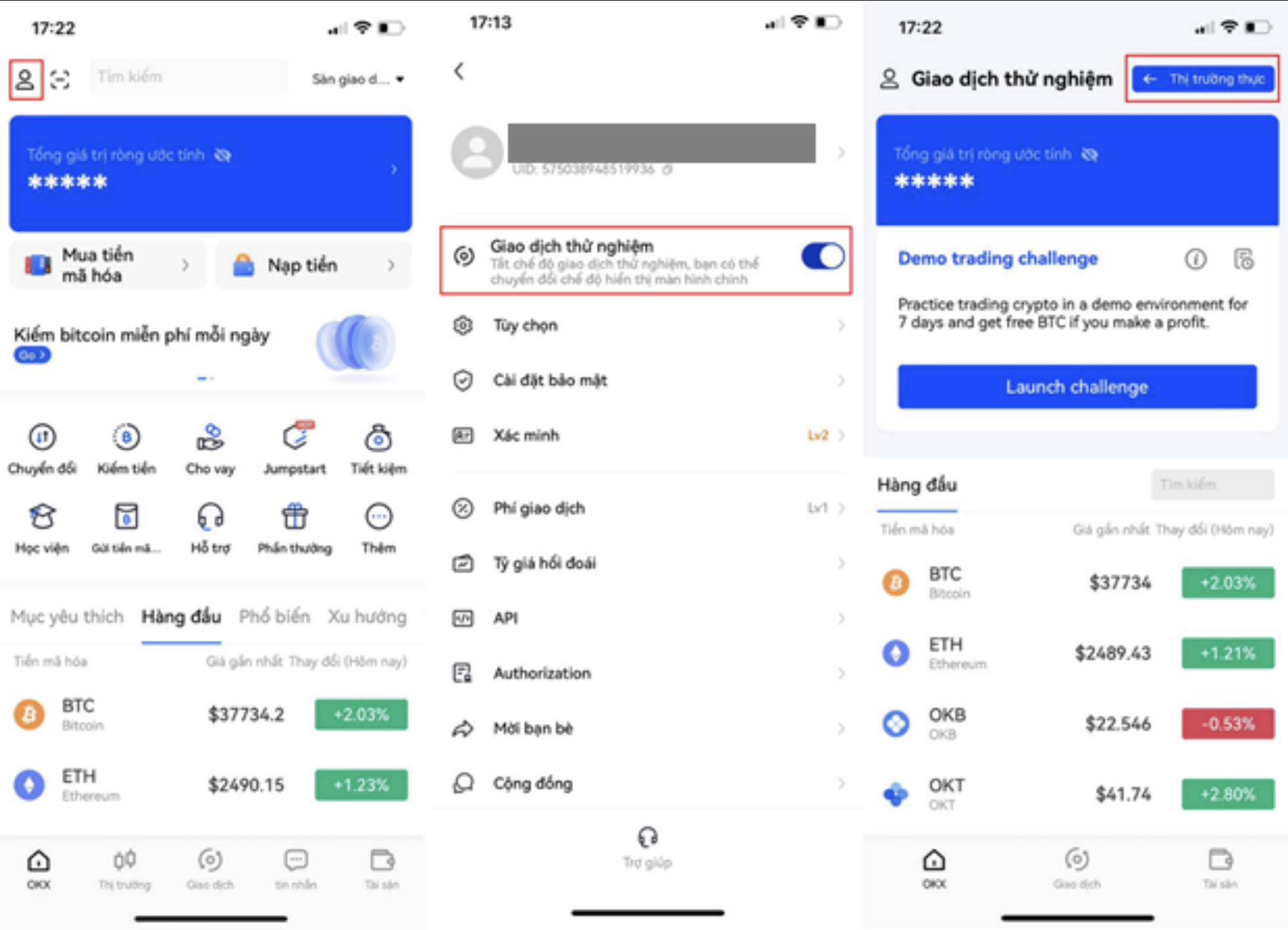 Như chúng tôi đã đề cập trong phần “Nhiệm vụ nâng cao”, bạn có thể chọn biểu tượng người dùng trên trang chủ và chọn “Giao dịch demo”.