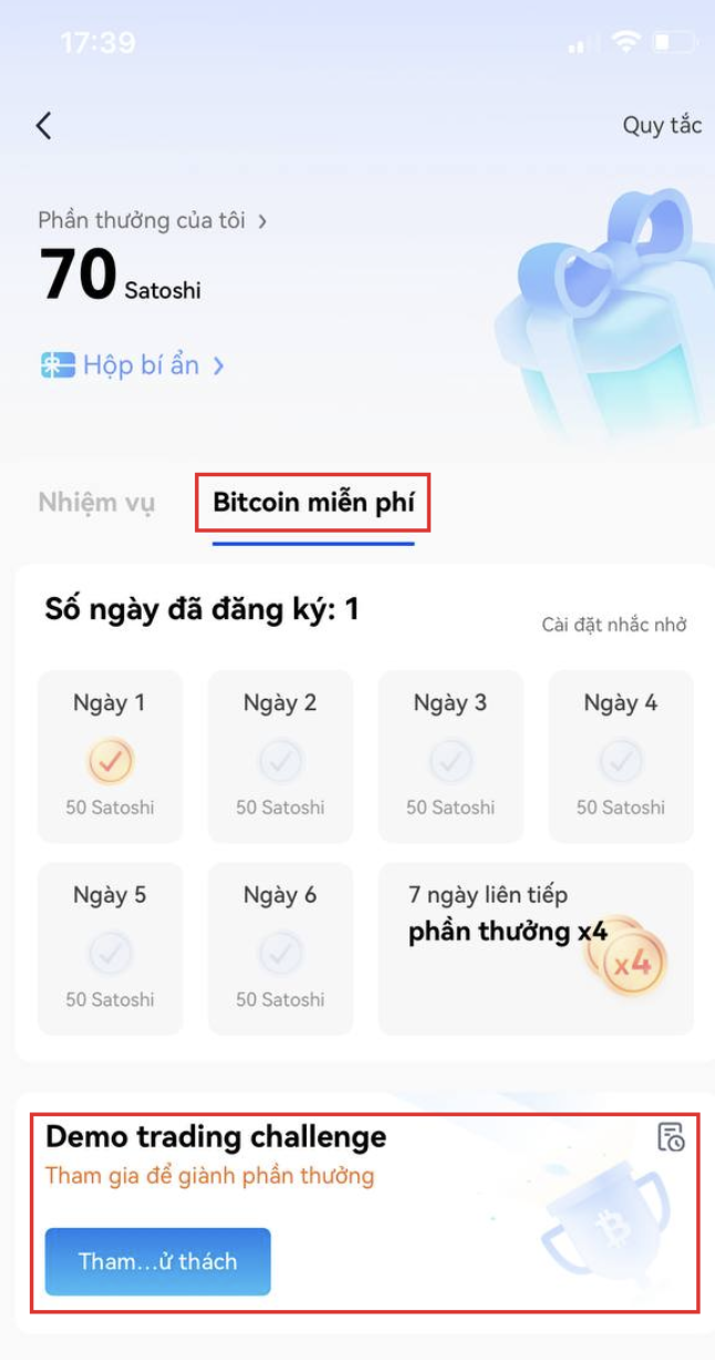 Ngoài ra, người dùng có thể kiếm được tới 1500 Satoshi mỗi tuần nếu họ đăng ký hàng ngày và thực hiện giao dịch demo. Họ cũng có thể có cơ hội giành được giải thưởng lên tới 100 $ trong những chiếc hộp bí ẩn.