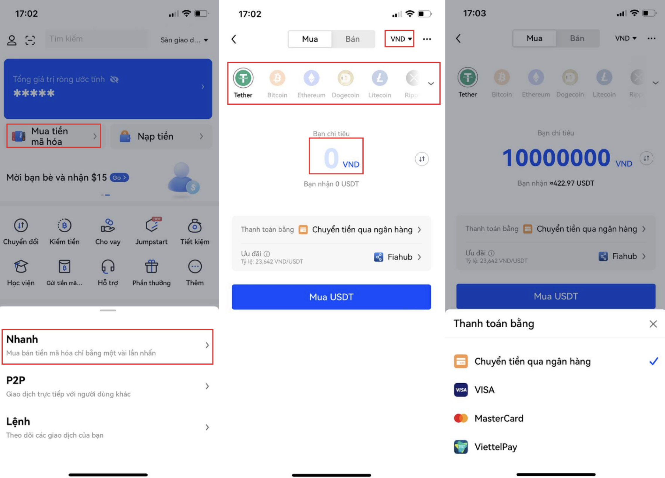 Bước 2: Click vào “Nhanh”. Tiếp theo, bạn chỉ cần chọn loại crypto bạn muốn mua và tiền tệ fiat bạn muốn chi tiêu. Bên cạnh đó, bạn cũng cần nhập số tiền fiat hoặc tiền mã hoá.