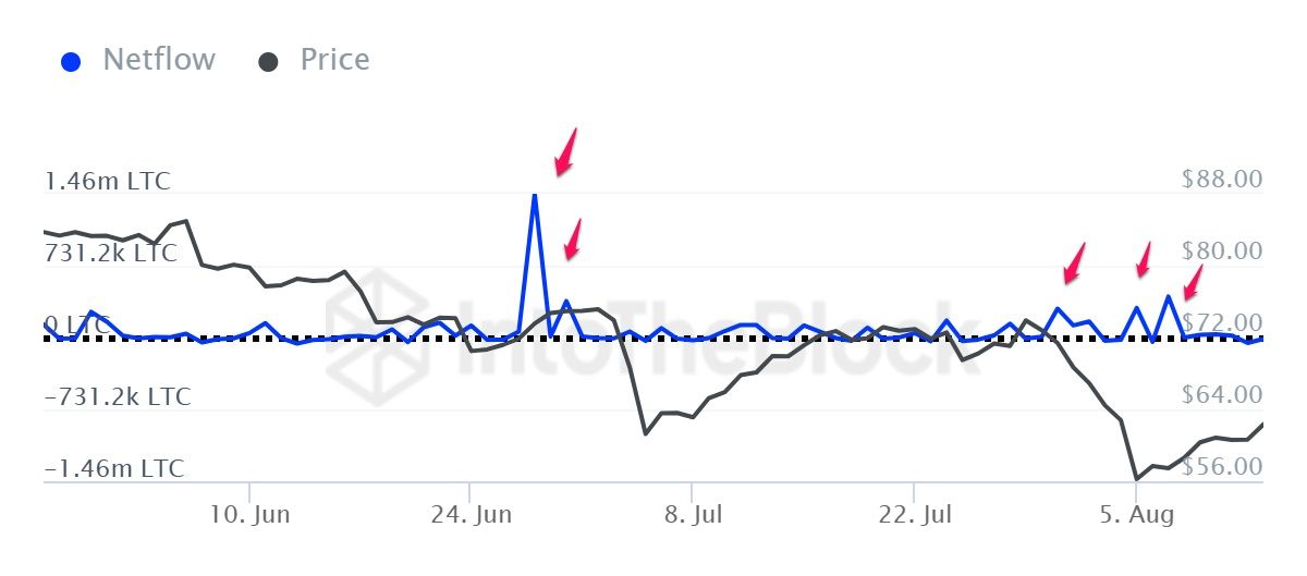 SponsoredDữ liệu IntoTheBlock cho thấy, phần lớn thời gian netflow của các ví lớn này duy trì ở mức dương, tức lượng tiền vào nhiều hơn ra. Trong cả hai lần sụt giảm, -25% vào tháng 7 và -30% trong tháng 8, đều ghi nhận Netflow tăng mạnh, chứng tỏ LTC càng giảm, các ví lớn này càng tích lũy.