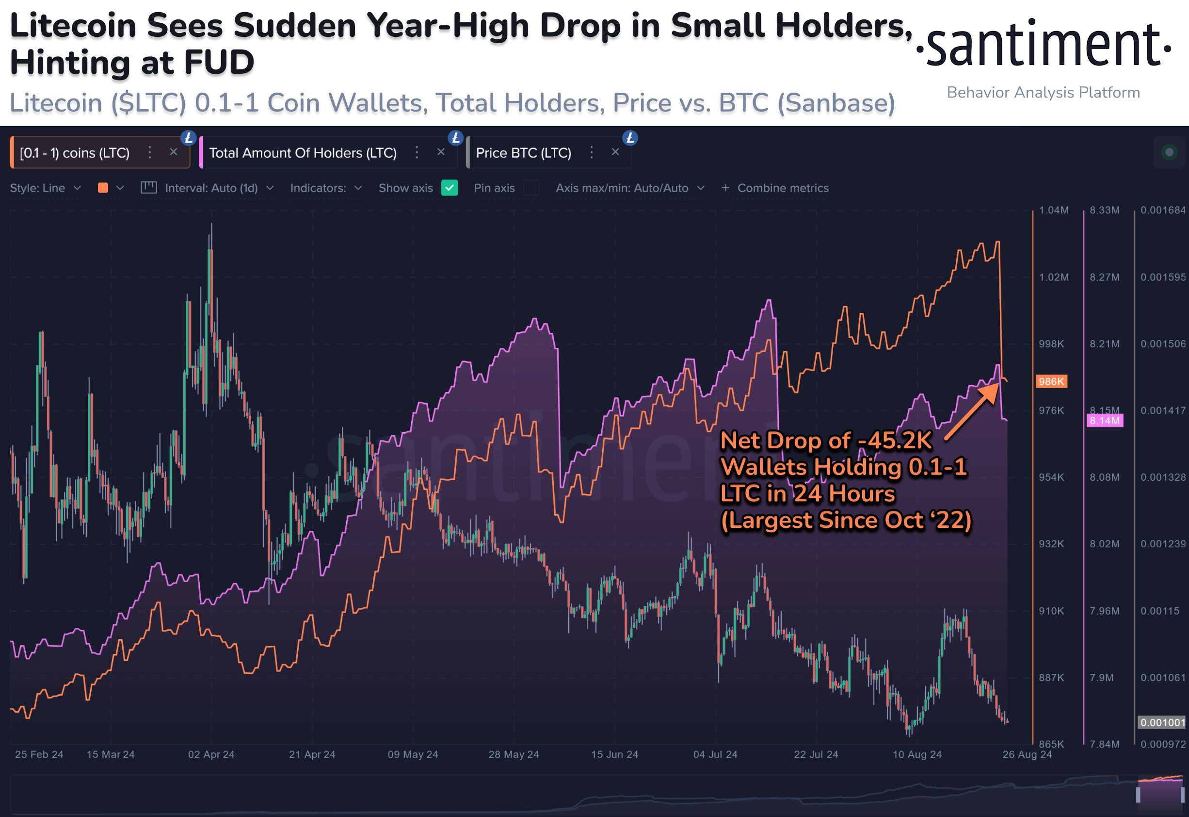 Nếu quan sát tổng số lượng holder của LTC, cũng nhìn thấy sự sụt giảm trong ngày 26, nhưng chỉ là một nhịp giảm nhỏ trong xu hướng tăng kéo dài từ giữa tháng 7.