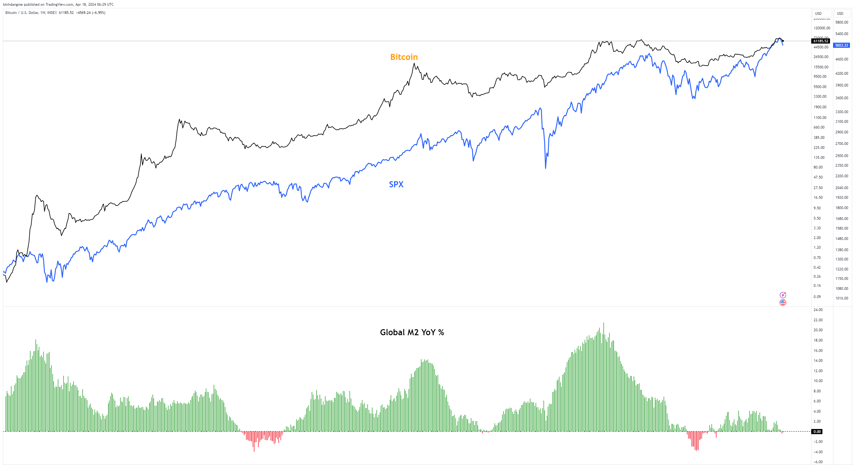 Một dữ liệu đáng quan tâm khác là biến động của nguồn cung M2. Đây là dữ liệu mang tầm ảnh hưởng toàn diện, Bitcoin và thị trường Crypto chưa khi nào chống lại xu hướng của dữ liệu. Trong tháng 4, nhiều dấu hiệu mới từ nguồn cung M2 rất đáng quan ngại.