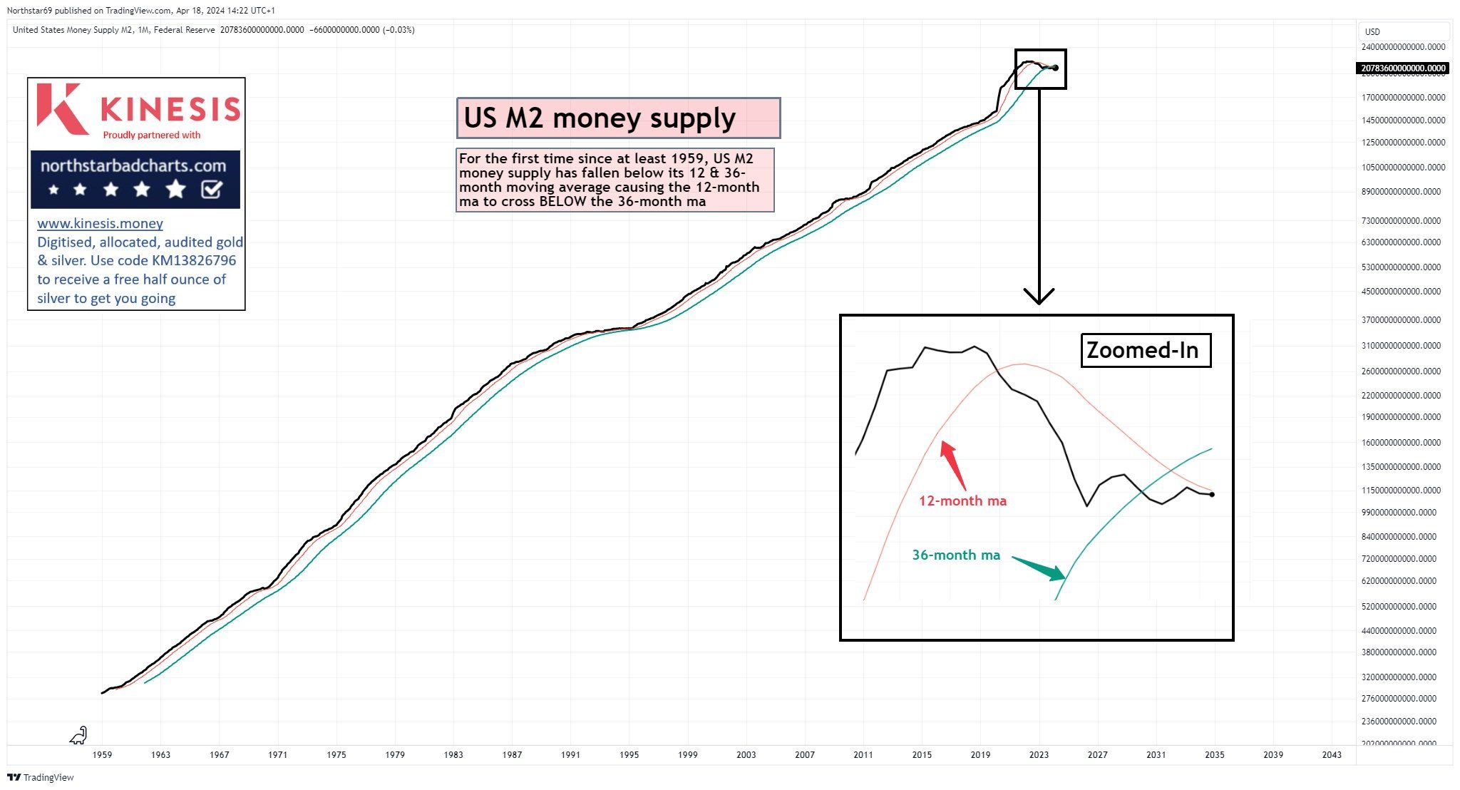 Nguồn cung M2 của Hoa Kỳ luôn trong một xu hướng tăng gần một thế kỷ nay. Nếu đo lường bằng đường trung bình 12 tháng (MA12) và trung bình 36 tháng (MA36) thì chưa khi nào MA12 cắt xuống MA36 cho đến tháng 4/2024. Đây là lần đầu tiên một giao cắt kỳ lạ trong một siêu chu kỳ như thế xuất hiện.