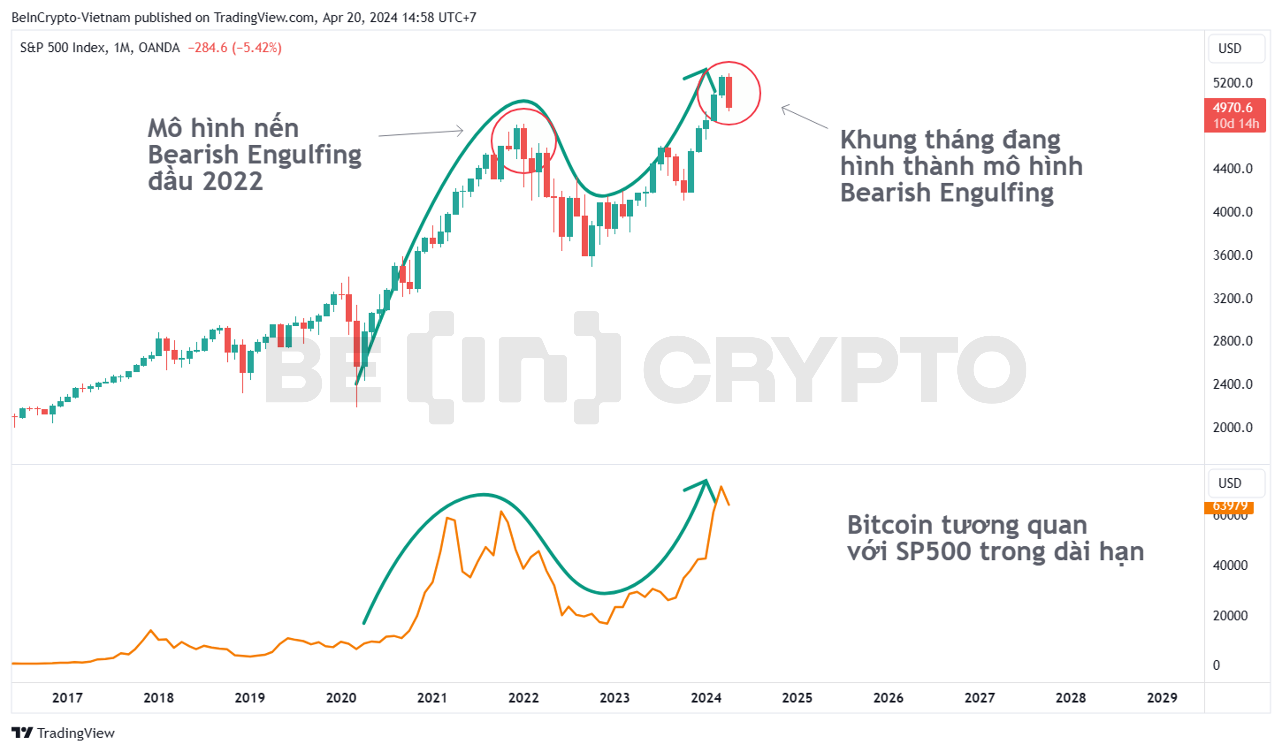 - Bitcoin trong góc nhìn dài hạn (khung tháng) cho thấy sự tương quan với SP500. Cùng với dấu hiệu nói trên, nhà đầu tư không nên loại trừ khả năng một thị trường gấu đã vừa mới bắt đầu cho cả hai tài sản này. Riêng Bitcoin, mạng blockchain lâu đời này vừa Halving thành công, và đang được nhà đầu tư kỳ vọng sẽ tăng giá như sau những lần Halving trước.