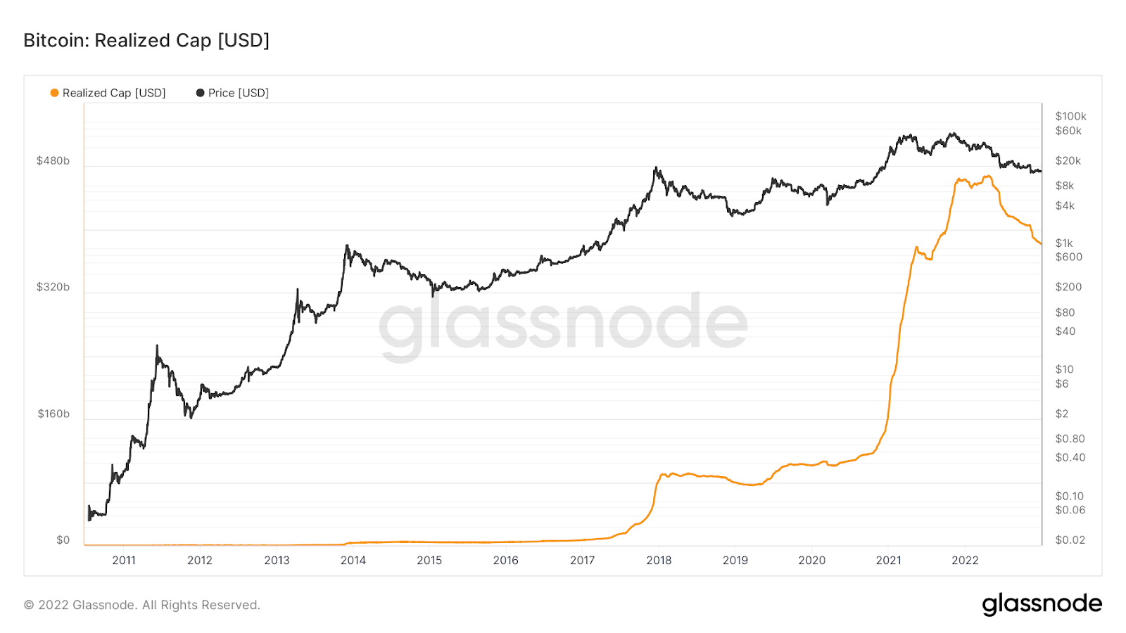 Trong biểu đồ bên dưới, chúng ta thấy rằng đã có sự sụt giảm có hệ thống và rất mạnh về vốn hóa thực tế kể từ cuối tháng 4/2022. Trên thực tế, chưa bao giờ trong lịch sử Bitcoin lại có sự sụt giảm dữ dội như vậy. Nó hiện chỉ đạt 382 tỷ USD. Con số này được nhìn thấy lần cuối vào tháng 8/2021.