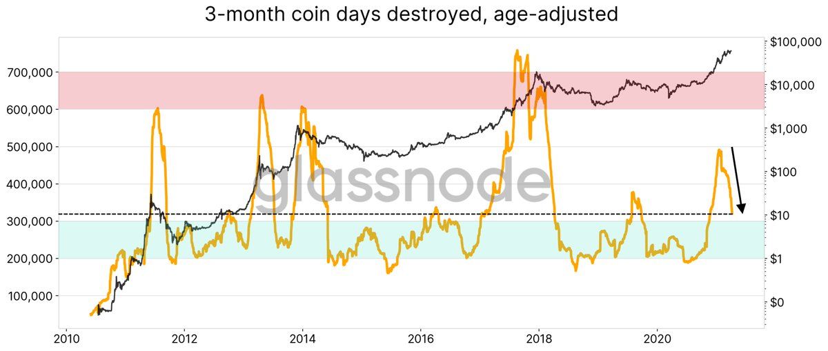 Hiện tại, chúng ta thấy có một tín hiệu có phần khác lạ. Đó là giá Bitcoin thì không giảm mà CDD lại giảm về “hỗ trợ”. Nghĩa là, giới “strong HODLers” thì vẫn chưa bán, chỉ có nhà đầu tư ngắn ngày đang mua đi bán lại trong bối cảnh nguồn cung cứ khan hiếm dần do bị hút vào các ví lâu giữ lâu hơn. Liệu rằng, điều này sẽ thêm phần thuyết phục cho một đợt tăng nữa của giá Bitcoin?