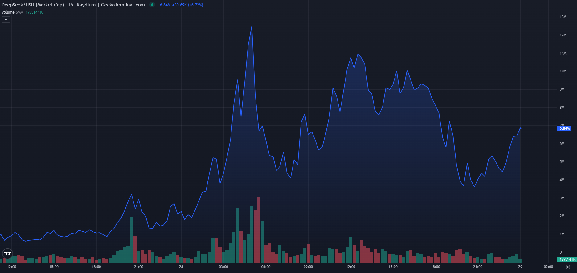 Một đồng meme giả mạo tự quảng cáo là DeepSeek đã đạt vốn hóa thị trường hơn 12 triệu USD hôm nay trước khi sụp đổ. Kể từ khi giao thức AI của Trung Quốc gây bão trong ngành công nghệ Mỹ, nhiều tài sản lừa đảo đã sử dụng thương hiệu của nó để thu lợi nhuận khổng lồ.