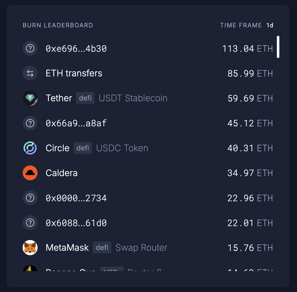 Theo dữ liệu mới nhất từ Ultra Sound Money, hợp đồng yêu cầu đã đốt 113.04 ETH trong 24 giờ qua, trị giá hơn 412,000 USD.