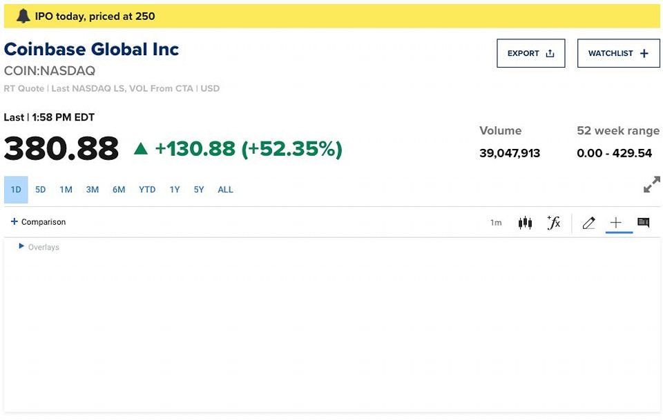 Việc Coinbase tiến hành IPO là một sự kiện lớn, được mong chờ trong nhiều ngày qua. Vào ngày 14 tháng 4, sự kiện này đã chính thức diễn ra. Cụ thể, Coinbase đã được niêm yết trên Nasdaq, sàn giao dịch chứng khoán của Hoa Kỳ. Tên cổ phiếu của sàn là COIN. Tại thời điểm viết bài, COIN đã bắt đầu giao dịch ở mức 381 USD/cổ phiếu.