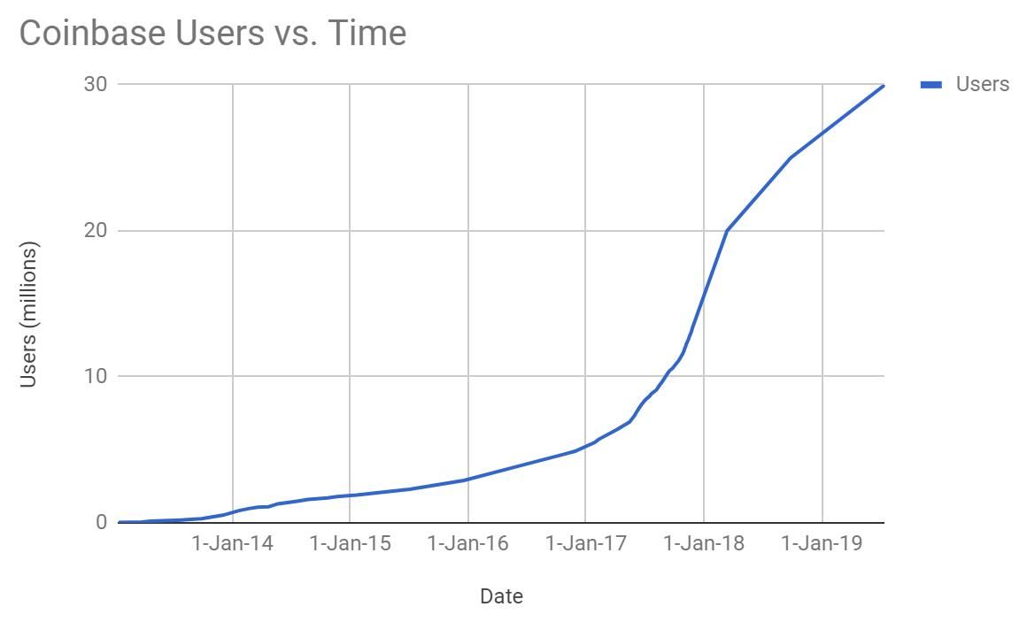 Cách đây 1 năm về trước, số người sử dụng Coinbase cũng đã vượt qua con số 30 triệu người. Khi đó, CIO của quỹ tiền điện tử kỹ thuật số Altana cho biết, Coinbase đã có hơn 30 triệu người sử dụng trong tháng 7/2019, tăng thêm 5 triệu người trong vòng 10 tháng trước đó.