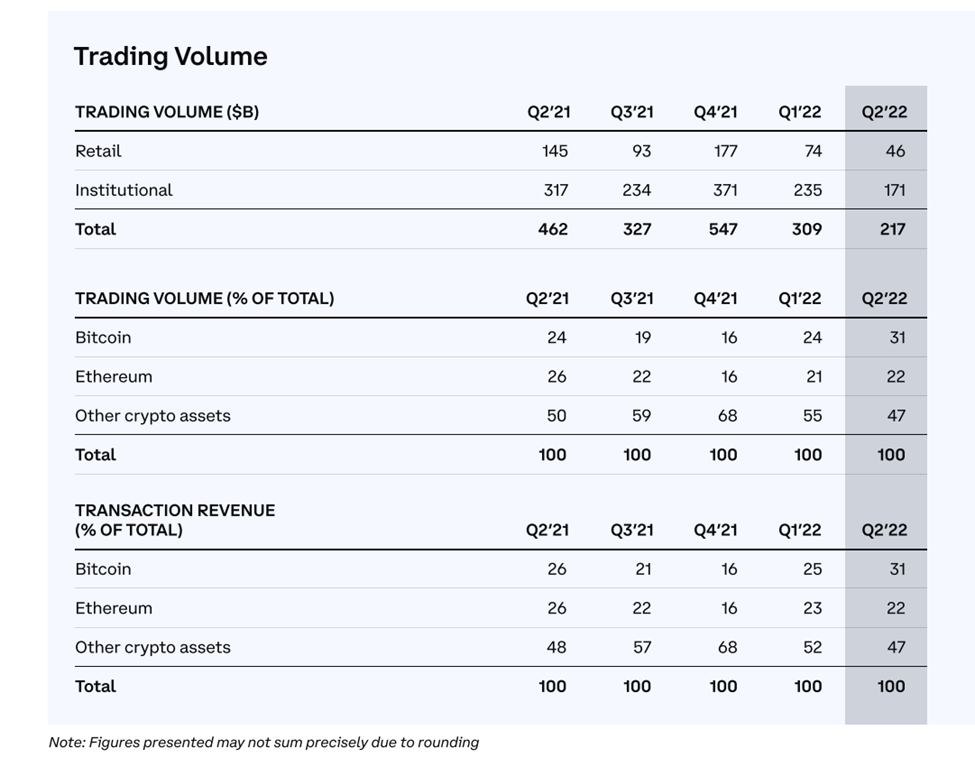 Bên cạnh đó, lượng giao dịch từ khách hàng nhỏ lẻ ít tại Mỹ và các giao dịch lớn diễn ra ở nước ngoài. Sàn giao dịch Coinbase chứng kiến tổng khối lượng giao dịch là 96 tỷ USD. Nếu so với Q1/2022 là 256 tỷ USD cho thấy khối lượng giao dịch đã giảm 63% so với quý trước. Theo báo cáo, nguyên nhân sụt giảm bị ảnh hưởng khi vốn hóa thị trường chung giảm mạnh. Kết quả này làm giảm thị phần của Coinbase từ 11.2% ở Q1 xuống còn 9.9% tính đến cuối Q2.