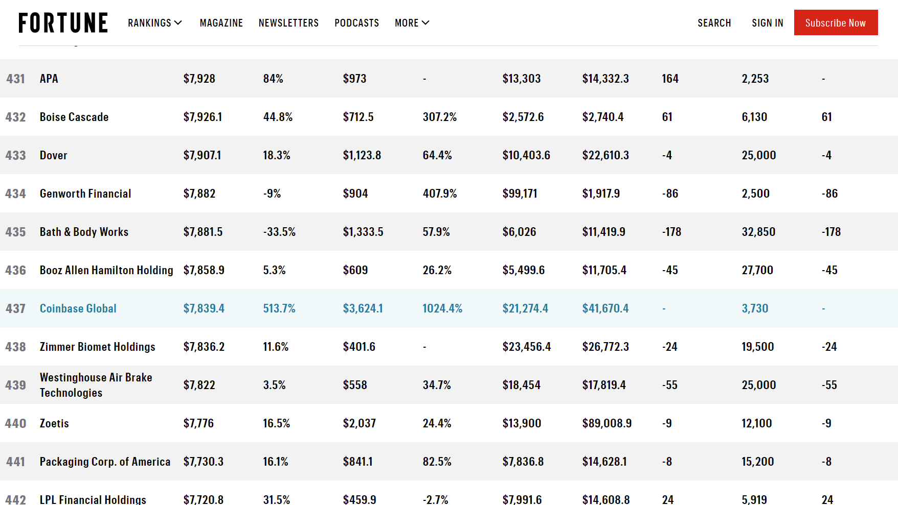Trong ấn phẩm Fortune 500 năm 2022, sàn giao dịch tiền điện tử Coinbase đã xuất hiện tại thứ hạng 437. Theo thống kê từ Fortune, doanh thu của Coinbase là 7.8 tỷ USD và lợi nhuận công khai là 3.6 tỷ USD. Ngoài ra, mức định giá công ty là 41.6 tỷ USD và giá trị tài sản nắm giữ là 21.2 tỷ USD. Chính những con số trên đã giúp Coinbase lần đầu có mặt trong bảng xếp hạng này.