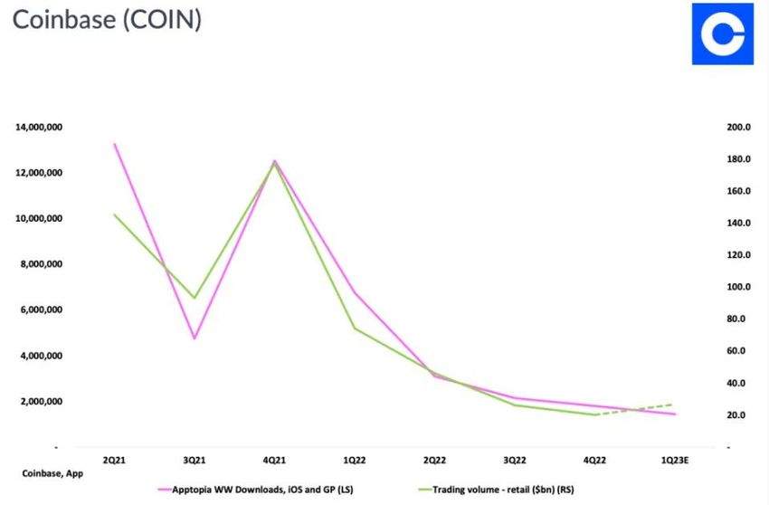 Theo Apptopia, một công ty nghiên cứu theo dõi số liệu sử dụng ứng dụng, cho biết số lượng người tải xuống ứng dụng Coinbase tiếp tục giảm.