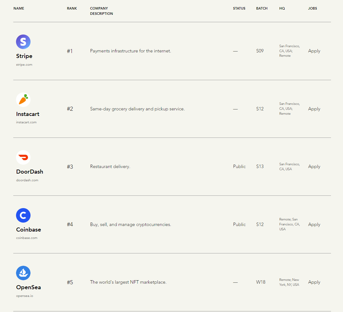 Đáng chú ý, sàn giao dịch Coinbase và NFT marketplace OpenSea lần lượt xếp hạng 4 và 5 trong danh sách Breakthrough Companies của YC. Trước đây, Coinbase từng được định giá khi vừa IPO là 86 tỷ USD, với giá đóng của cổ phiếu COIN ở mức 328.2 USD. Vào tháng 1/2022, OpenSea được định giá 13.3 tỷ USD sau vòng gọi vốn Series C trị giá 300 triệu USD.