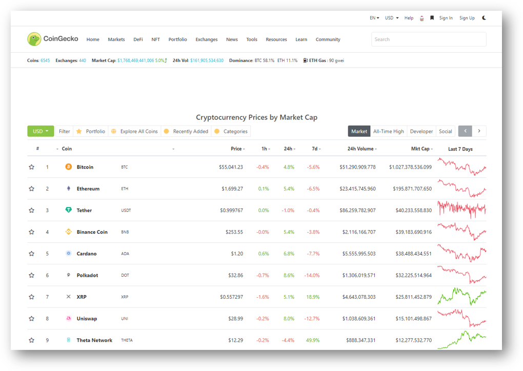 - CoinGecko không chỉ có những tính năng cập nhật giá theo thời gian thực. Mà còn có thể bắt trend rất tốt. Những xu hướng mới nổi hiện tại như DeFi, NFT…được CoinGecko tạo ngay những trang riêng cho người dùng theo dõi.