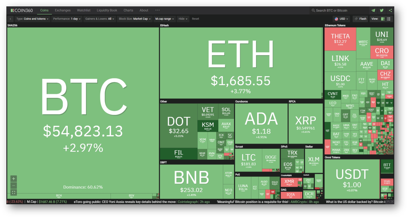 - Coin360 nổi tiếng với giao diện ô thị phần. Ô càng lớn chứng tỏ thị phần của đồng coin đó càng lớn trong tổng vốn hóa. Ô xanh là coin tăng. Ô đỏ là coin giảm. Cách trình bày này khiến người dùng vào là hiểu được cơ bản thị trường đang trong tình trạng thế này. Và đây cũng là đặc sản riêng biệt của Coin360.