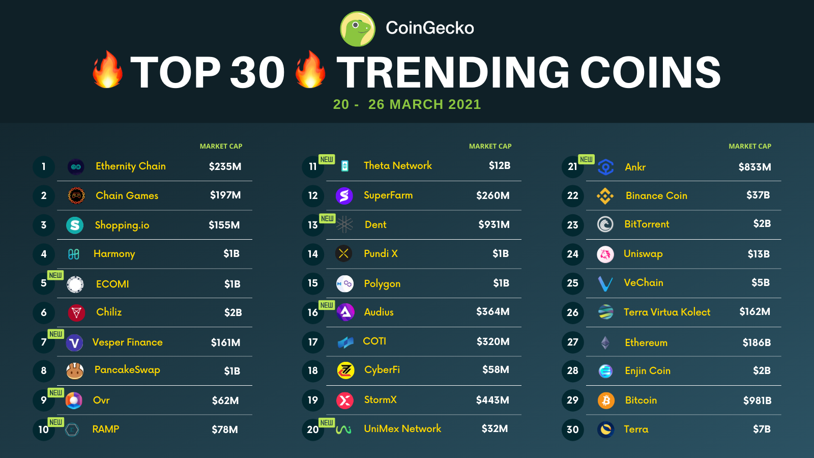 - CoinGecko thường xuyên cập nhật danh sách những đồng coin HOT trong ngày/tuần/tháng dựa vào số liệu họ thu được.