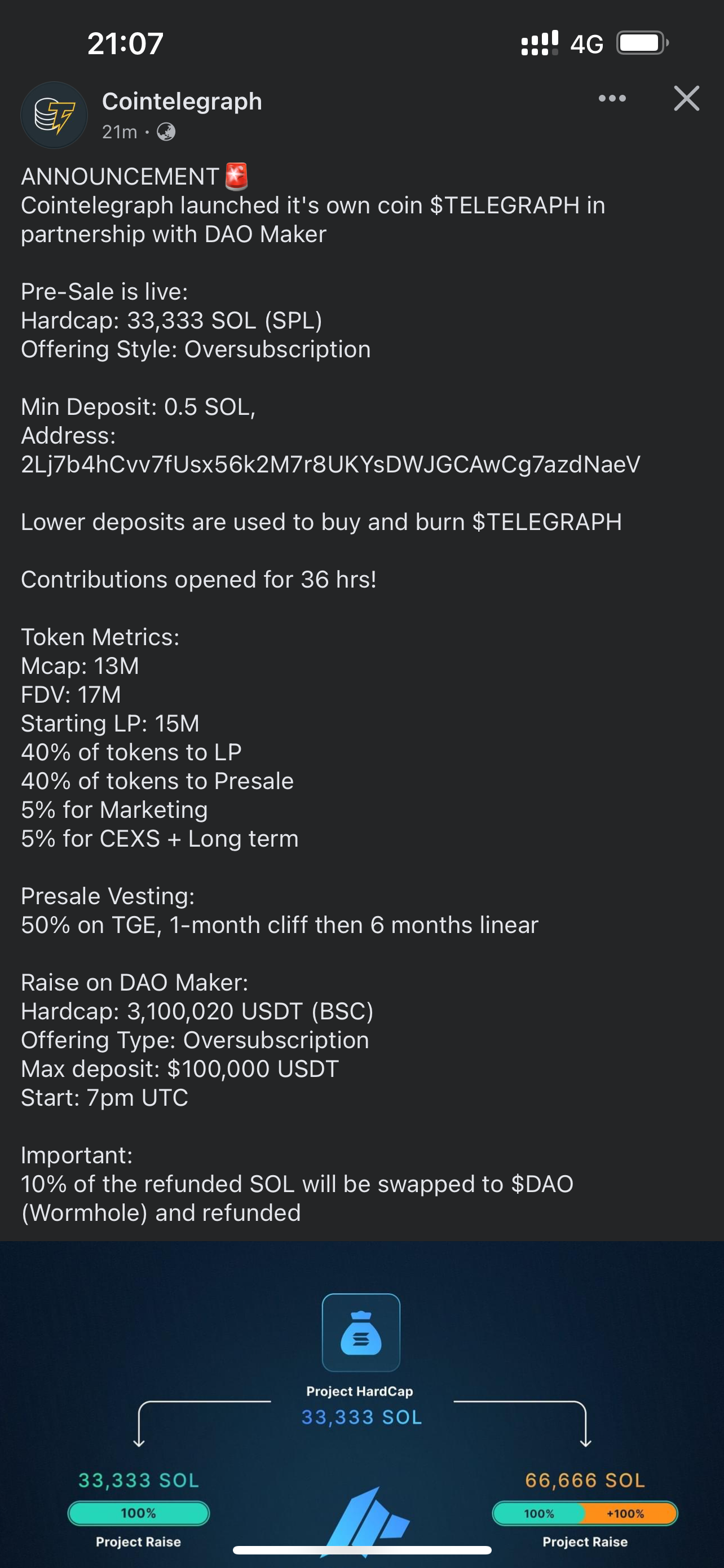 Một trang web về thị trường tiền điện tử khá phổ biến trên thế giới, Cointelegraph, mới đây đã phát đi thông báo trên Facebook về việc hợp tác với DAO Maker để cho ra mắt token riêng của mình, TELEGRAPH.