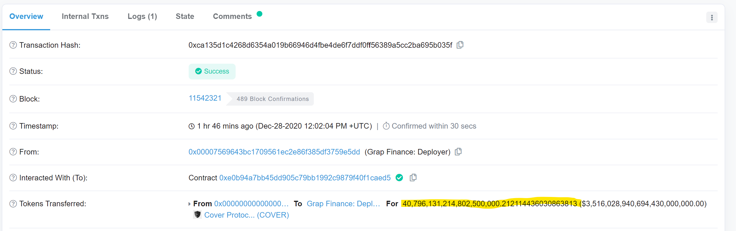 Hiện tại chưa có thêm thông tin chi tiết về lỗi này. Nhưng một kẻ tấn công có am hiểu giao thức DeFi đã phát hiện và tận dụng lỗi của giao thức để đúc ra hơn 40 quintillion Token Cover. (xem hình)